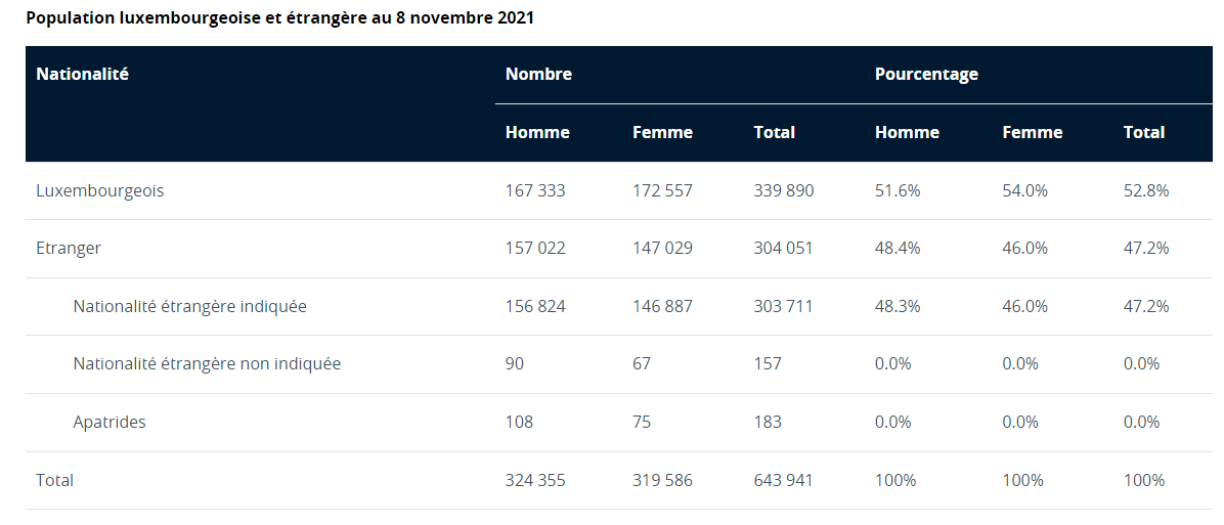6 vun 10 Leit déi zu Lëtzebuerg wunnen, hunn d’Lëtzebuerger Nationalitéit oder sinn zu Lëtzebuerg gebuer. 13 Prozent vun den Awunner déi hei am Land op d’Welt komm sinn, hunn deemno net d’Lëtzebuerger Nationalitéit.