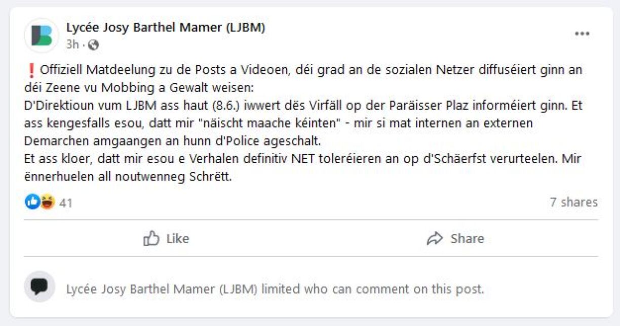 De Mamer Lycée Josy Barthel huet an enger offizieller Matdeelung iwwer Facebook och op de Virfall reagéiert an erkläert, et géif een esou ee Verhalen net toleréieren an op d’Schäerfst verurteelen. “Mir ënnerhuelen all noutwenneg Schrëtt.”
