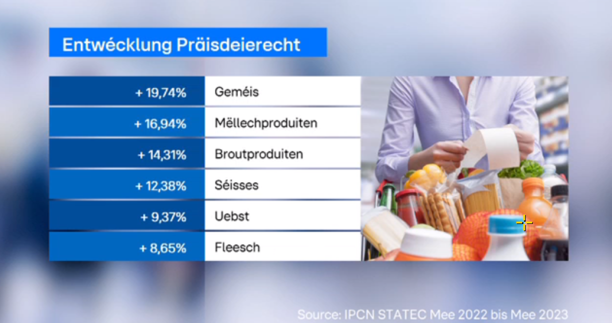 De leschten Zuelen, déi virleien, no ass Lëtzebuerg ee vun den traurege Spëtzereider, wat den Aarmutsrisiko an der Eurozon ubelaangt, an dat obwuel ee schafft. Eng Aarbecht schützt deemno net méi onbedéngt viru Prekaritéit. Duerchschnëttlech läit den Taux bei 13,5% an domat méi héich wéi an eisen Nopeschlänner. An der Belsch läit e bei ronn 5%. Donieft weisen och déi neisten Zuele vum Statec ronderëm de sougenannten IPCN eng kloer Tendenz bei der Präisdeierecht. Dësen Index fir d’Entwécklung vun de Präisser fir bestëmmte Wueren a Servicer fir Konsumente wéist et gouf mat 12,19%. Allgemeng eng zolidd Hausse bei Liewensmëttel an Non-Alkoholeschem. Bei eenzele Liewenmëttelklassen ass dës Hausse nach méi frappant, virop d’Geméis, bei deem ee vum Mee 2022 op Mee 2023 elo bal 20% méi bezilt, och Mëllech a Broutproduite si staark geklommen a Kleeder respektiv Schong sinn iwwer 5% méi Deier ginn. Bei de Vakanze sinn et 12%.