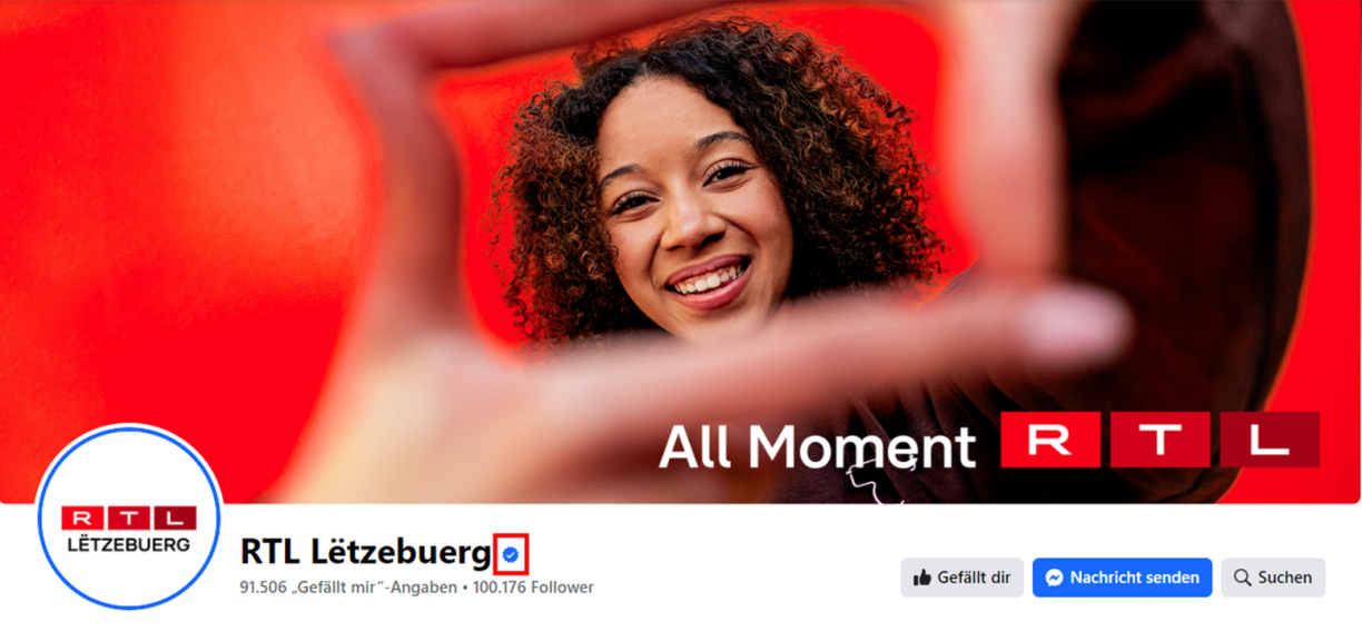 Sollt Dir e Message an de soziale Medie vun RTL oder och anere Medienhaiser kréien, gëllt et op verschidde Saachen opzepassen: RTL Lëtzebuerg an RTL Infos hu béid de bloe verified Button, deen der am Screenshot hei drënner rout ëmkreest gesitt.