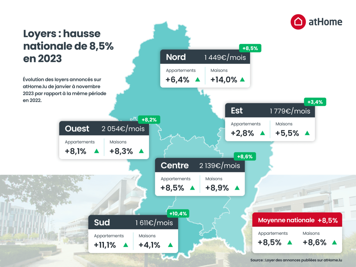 Op dat ganzt Joer gekuckt, an no der staarker Hausse zejoert, sinn déi annoncéiert Verkafspräisser ëm 7% zréck gaangen. An där selwechter Zäit sinn d’Loyeren am ganze Land explodéiert: +8,5%. Am Süde sinn et souguer iwwer 11% bei den Appartementer.