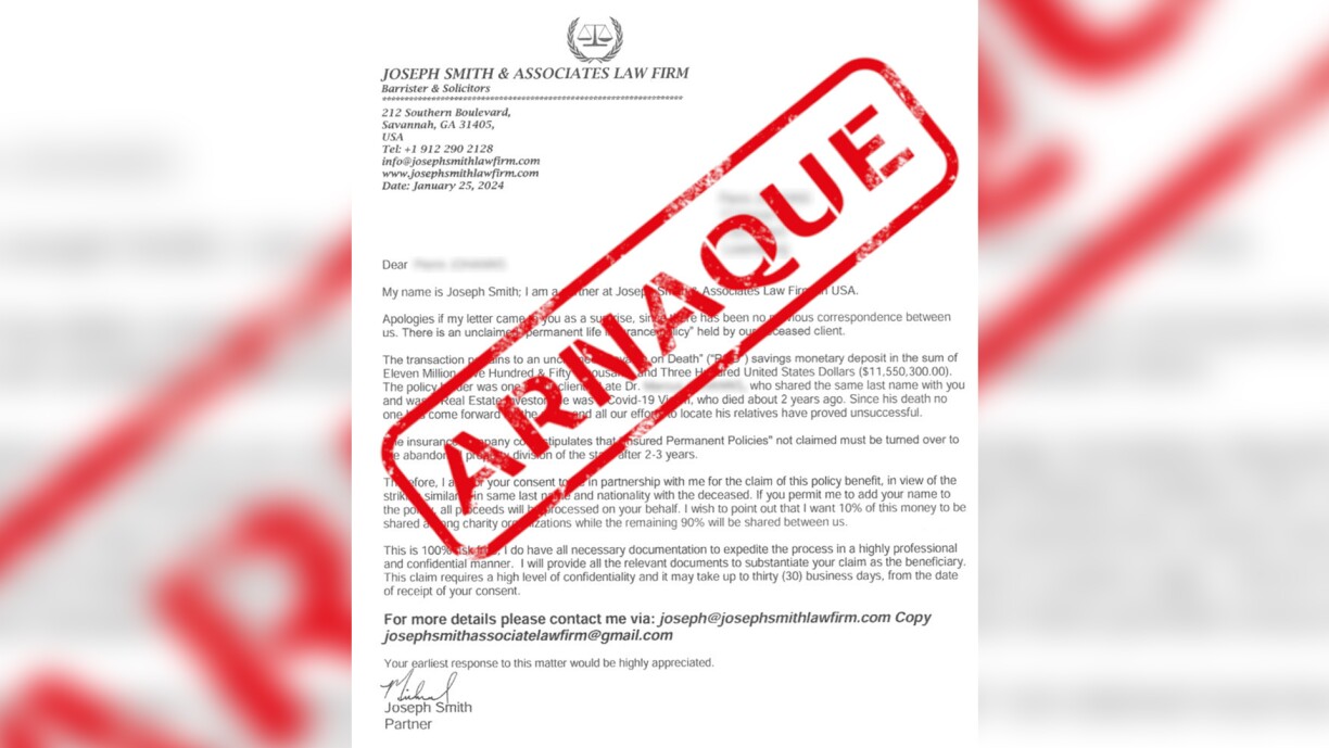 D’Schreiwes, wat dacks per Bréif kënnt, kritt dat presuméiert Affer matgedeelt, datt Si eppes vun engem Familljemember oder enger Persoun mam selwechten Numm ierft. D’Affer gëtt dann opgefuerdert, sech esou séier wéi méiglech bei engem falschen Affekot ze mellen.