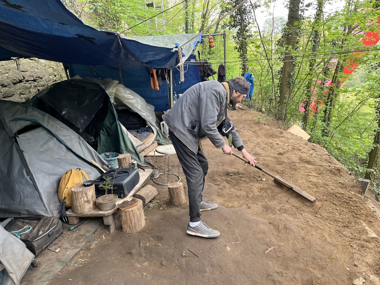 De Stefan a säi Kolleeg Ferenc huelen eis mat an de Bësch um Kierchbierg. Hei wunne si zanter annerhallwem Joer Joer an hiren Zelter, zesumme mat hire Muppen Chilli a Pici.
