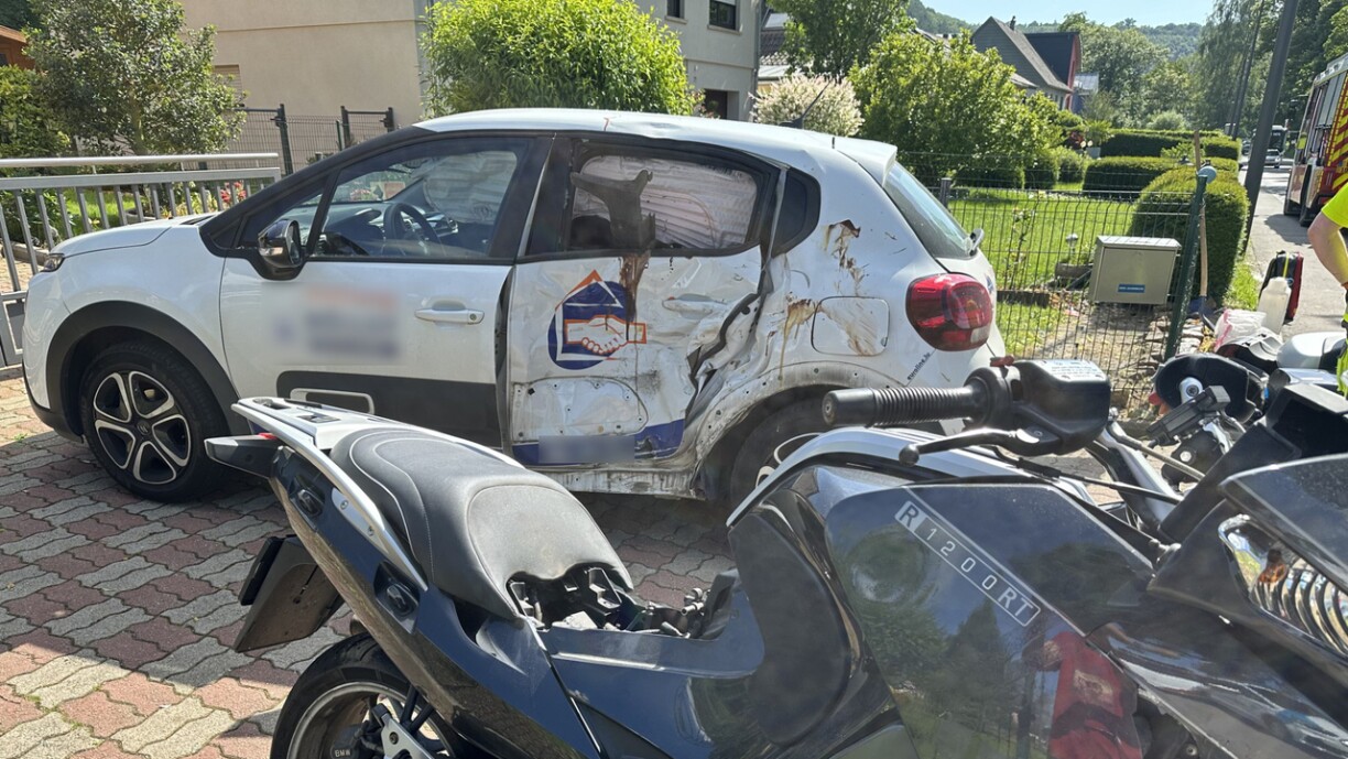 Um 15.48 Auer koum et op der Route d’Arlon zu Bruch zu engem Accident mat engem Blesséierten, bei deem en Auto an e Motorrad gerannt ass. Hei waren d’Ekippen aus der Stad, Lëntgen, Tënten, Béiwen-Atert a Miersch am Asaz.