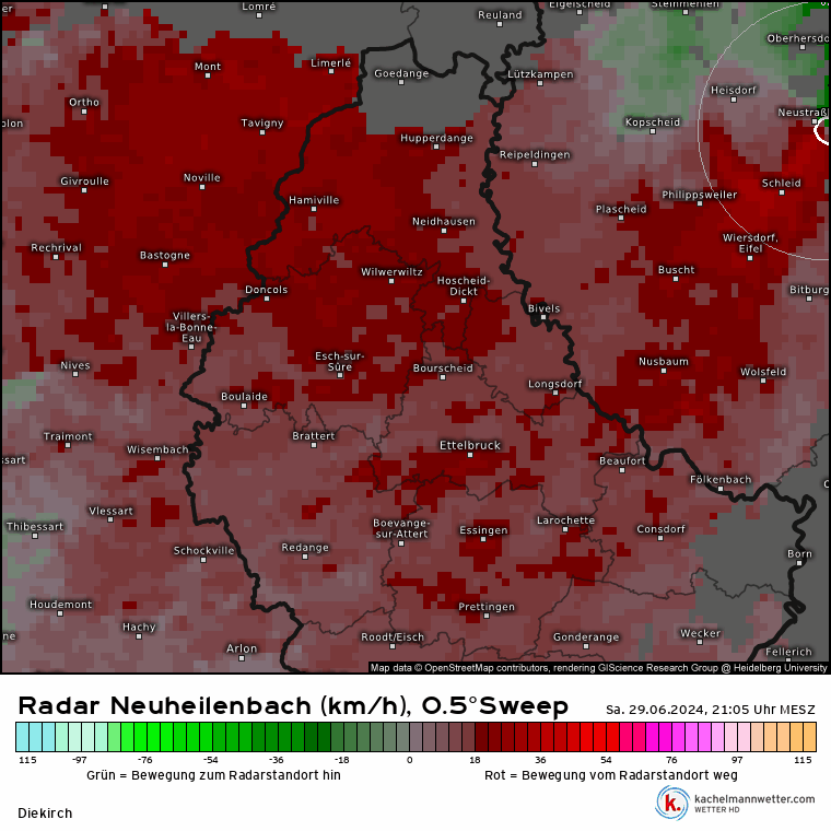 Philippe Ernzer:“Do hu mer dann um Radar verschidde Signature gehat, vu ganz lokale Rotatiounskären. Mä dat ass typesch fir esou e Bow-Echo, et ass immens vill Dynamik an esou enger Front, an do kann et mol virkommen, dass einfach eng Rotatioun um Radar mol ze gesinn ass. Ob dat dann eng Auswierkung op de Buedem huet, dat ass dann sou eng aner Fro. Mä et ginn aner Plazen, do waren e bësse méi staark Rotatiounssignaturen. Ech ka lo net onbedéngt vum Raum Biwer schwätzen, well ech do grad net ënnerwee sinn, mee eng aner Signatur, do huet sech méi a Richtung Biissen gewisen, Richtung Feelen an deem Beräich.”