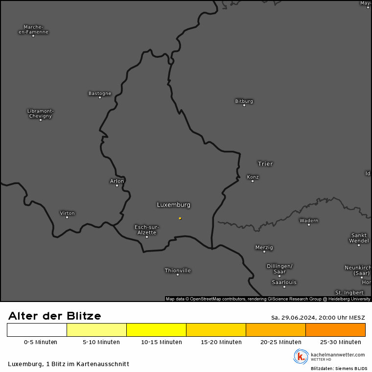 Bei de Blëtzer war och richteg eppes lass um Himmel. Dat gëtt och mat der Kaart vu Kachelmannwetter ënnerluecht, wou een d’Aktivitéite vun de Blëtzer e Samschdeg den Owend gesäit.