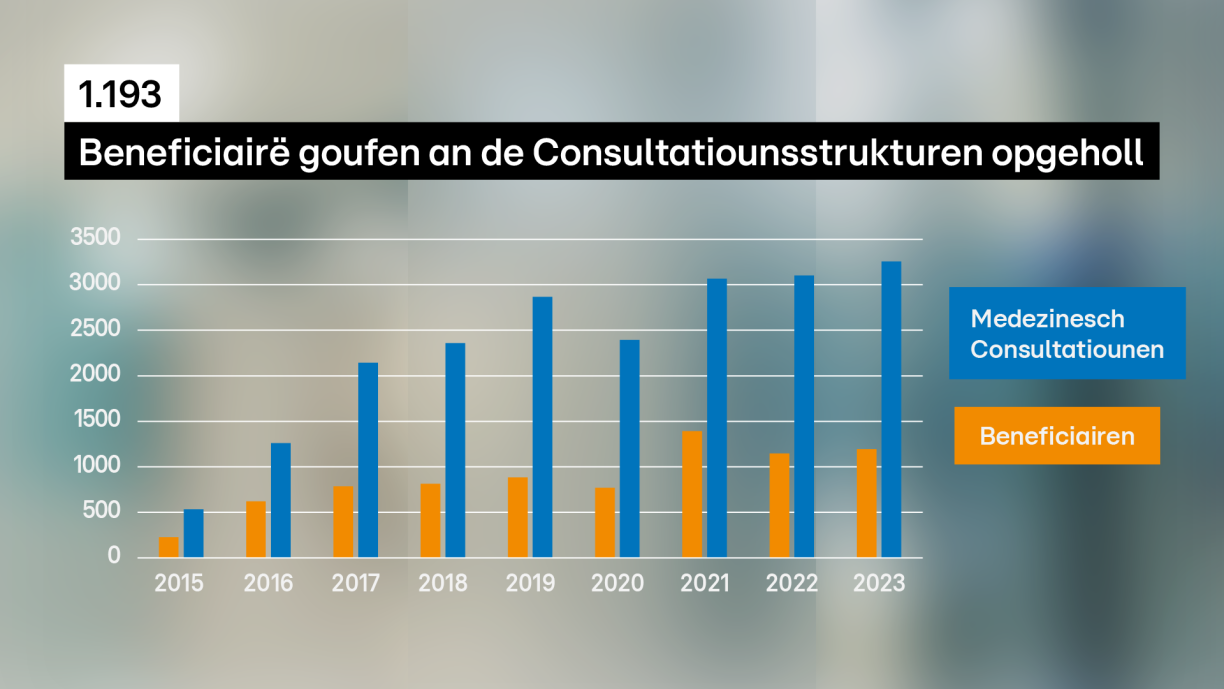 E Chiffer u Beneficiairen, deen iwwert déi lescht 3 Joer stabel tëscht 1.200 an 1.300 Mënsche bliwwen ass. D’Problemer vu Santé Sociale a Santé mentale géingen awer progressiv zouhuelen, wat ee géing un der Explosioun vun de sozialen a psychologeschen Interventioune gesinn. “An dëse Phänomen steet ouni Zweiwel an enker Relatioun mat der Aarmut, vun där hei zu Lëtzebuerg ëmmer méi Mënsche concernéiert sinn”, ënnersträicht de President vu Médecins du monde, den Dr. Bernard Thill. “Ëmmer méi Leit komme wéinst soziale Problemer bei eis”, seet och de Ralph Hank, Sekretär vu Médecins du monde. Dëst wier awer natierlech och wéinst der Aféierung vum Pilotprojet vun der universeller Gesondheetsversuergung fir jiddereen. Eng Mesure, déi och e soziale Suivi vun de Beneficiairë fuerdert.