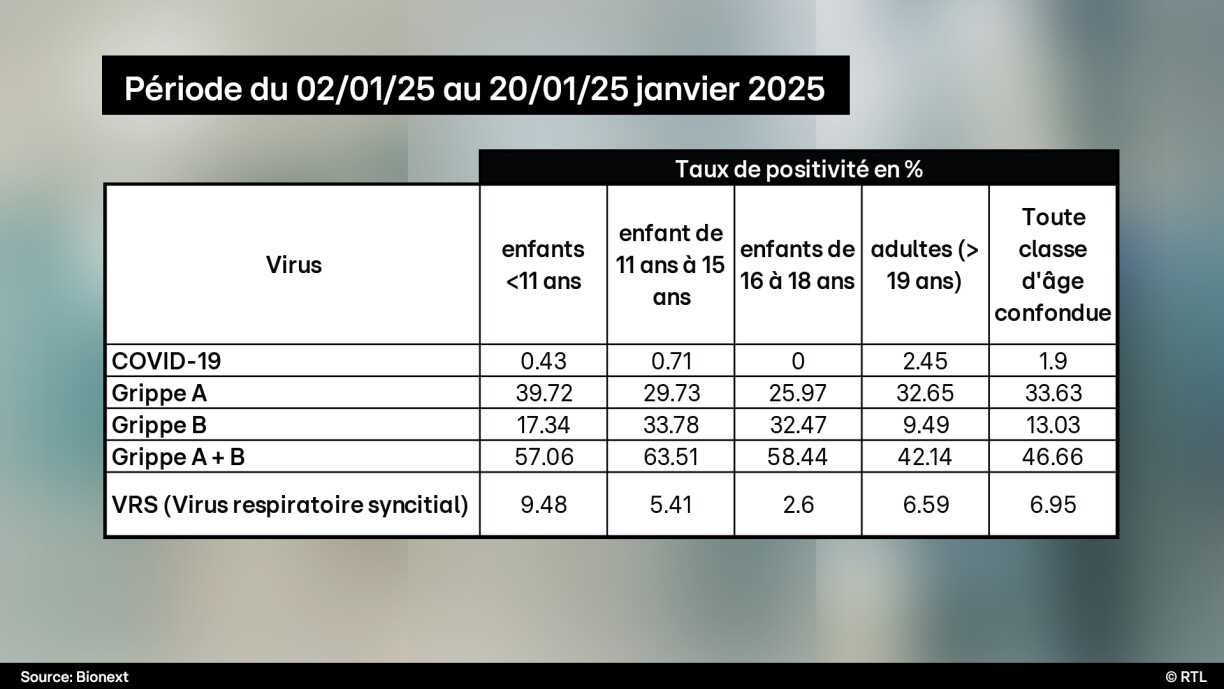 Bionext huet an engem detailléierten Tableau matgedeelt, dass bal 40% vun den Tester bei Kanner ënner 11 Joer den Influenza-Virus A am Januar detektéiert hunn. Bei eppes iwwer 17% ass et de Grippe-Virus B. Zesumme maachen dat iwwer 57% vun all den Tester aus. Och de VRS (virus respiratoire syncitial) ass mat bal 10% an dëser Alterskategorie vergläichsweis staark vertrueden.