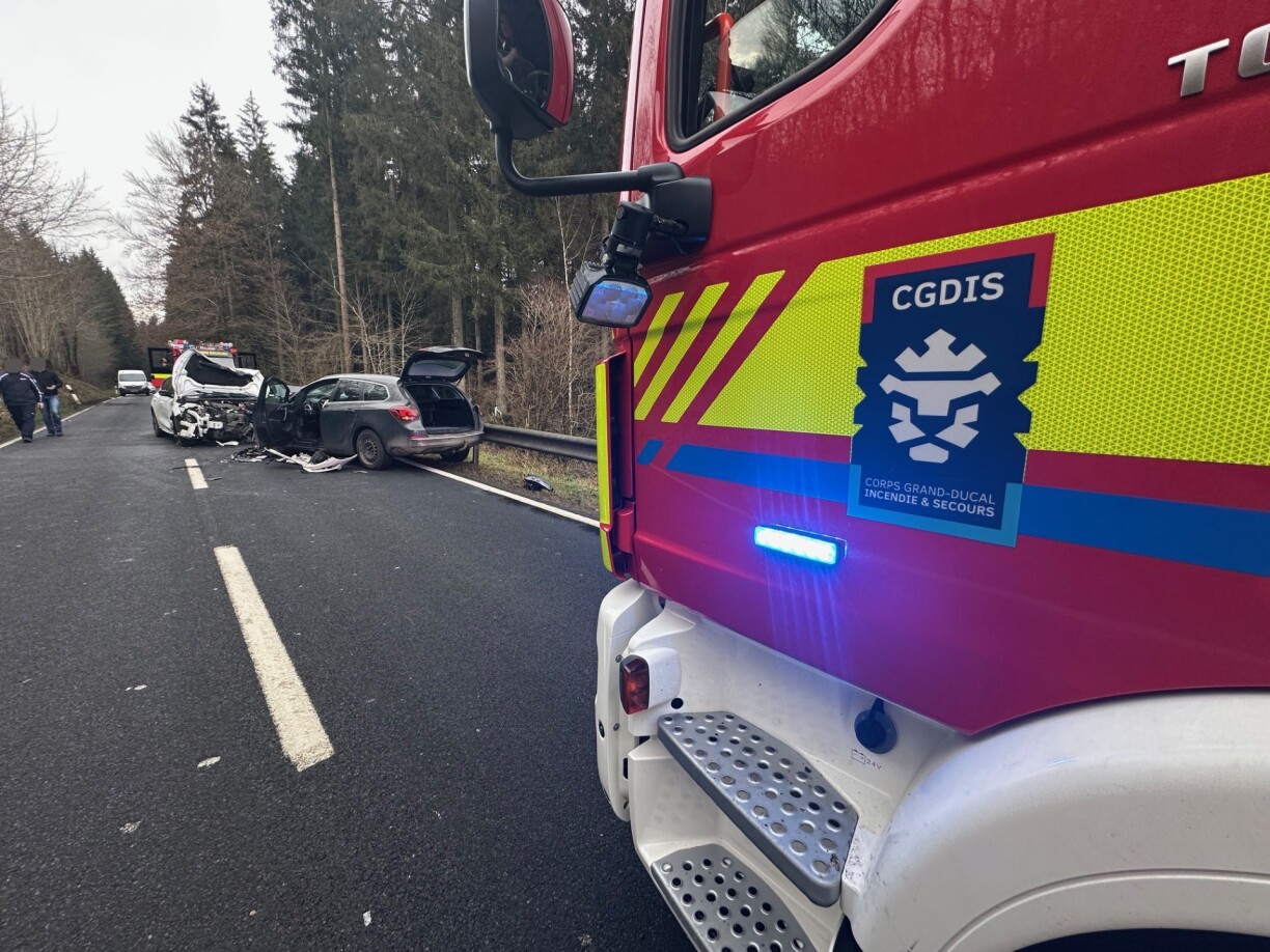 Méi genee sinn déi zwee Autoen um CR101 am Direndall kollidéiert. Wéi de CGDIS preziséiert, goufe bei der Kollisioun zwou Persoune blesséiert. Um Asaz waren de Samu-Noutdokter, d’Ambulanciere vu Lëntgen an d’Pompjeeë vu Miersch a Koplescht.