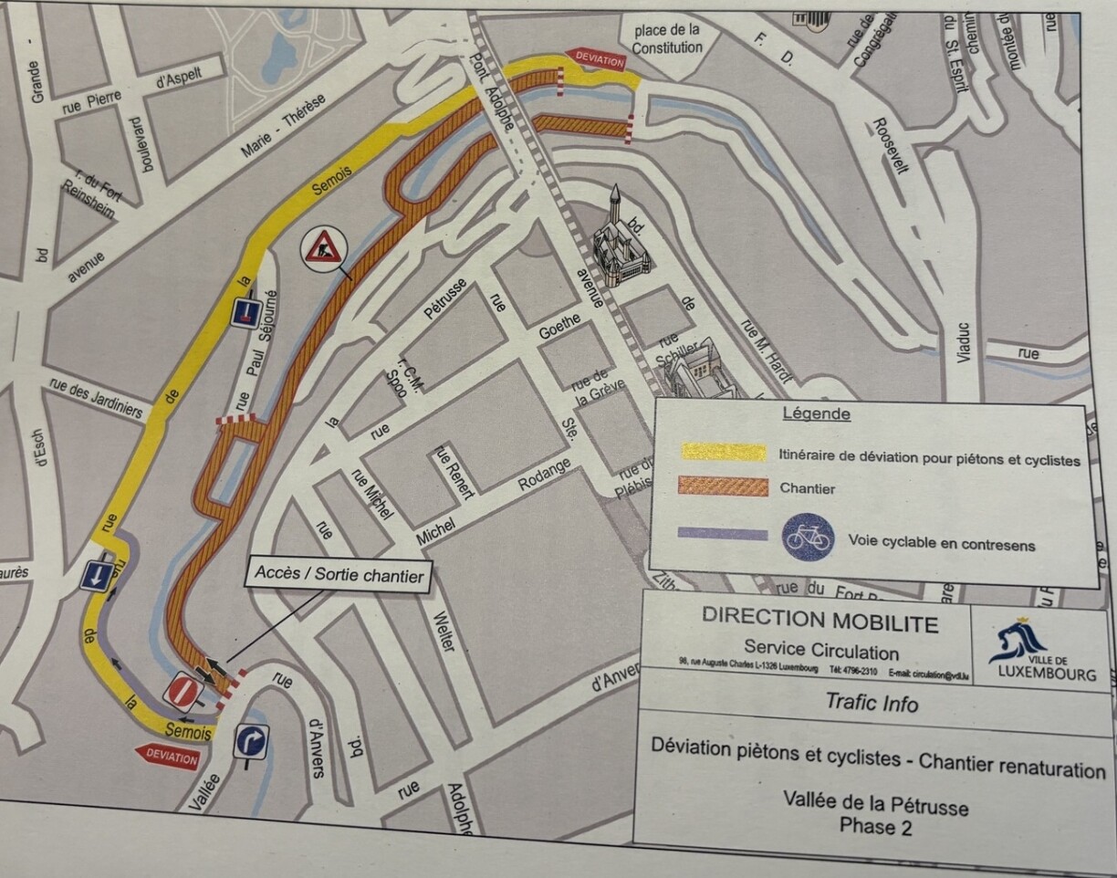 De Schäffe Patrick Goldschmidt huet sengersäits erkläert, ewéi Deviatioune fir de Chantier wäerten ausgesinn: d’Vëlospist duerch d’Péitruss gëtt iwwer d’Rue de la Semois (hannert der BIL) eropgeleet. Aus Sécherheetsgrënn gëtt d’Zirkulatioun fir d’Gefierer an där Strooss à sens unique Richtung Gare.