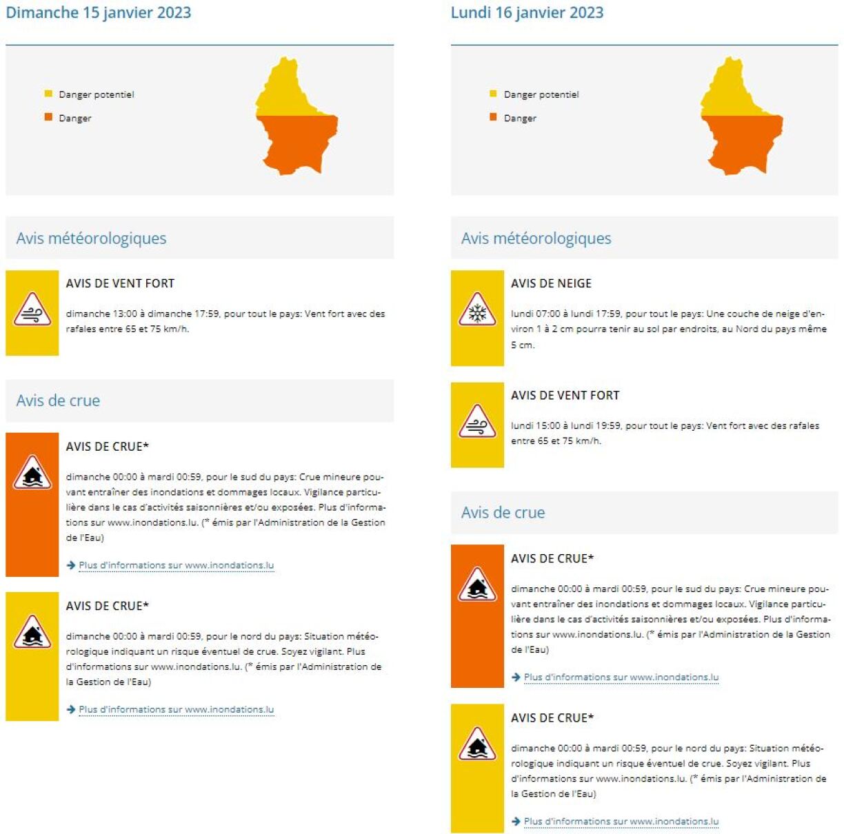 Nieft dem Reen, an de Peegele vun de Flëss, déi heiduerch klammen, gëtt et awer och nach eng Alerte vu Meteolux wéinst dem Wand, dee bis zu 75 Stonnekilometer kann erreechen. Dobäi kënnt da fir e Méindeg tëscht 7 an 18 Auer nach eng Warnung wéinst Schnéi dee wäert erofkommen. Uechter d’Land ass mat 1-2 Zentimeter ze rechnen, woubäi op den Éisleker Koppen och alt emol 5 Zentimeter dra sinn.