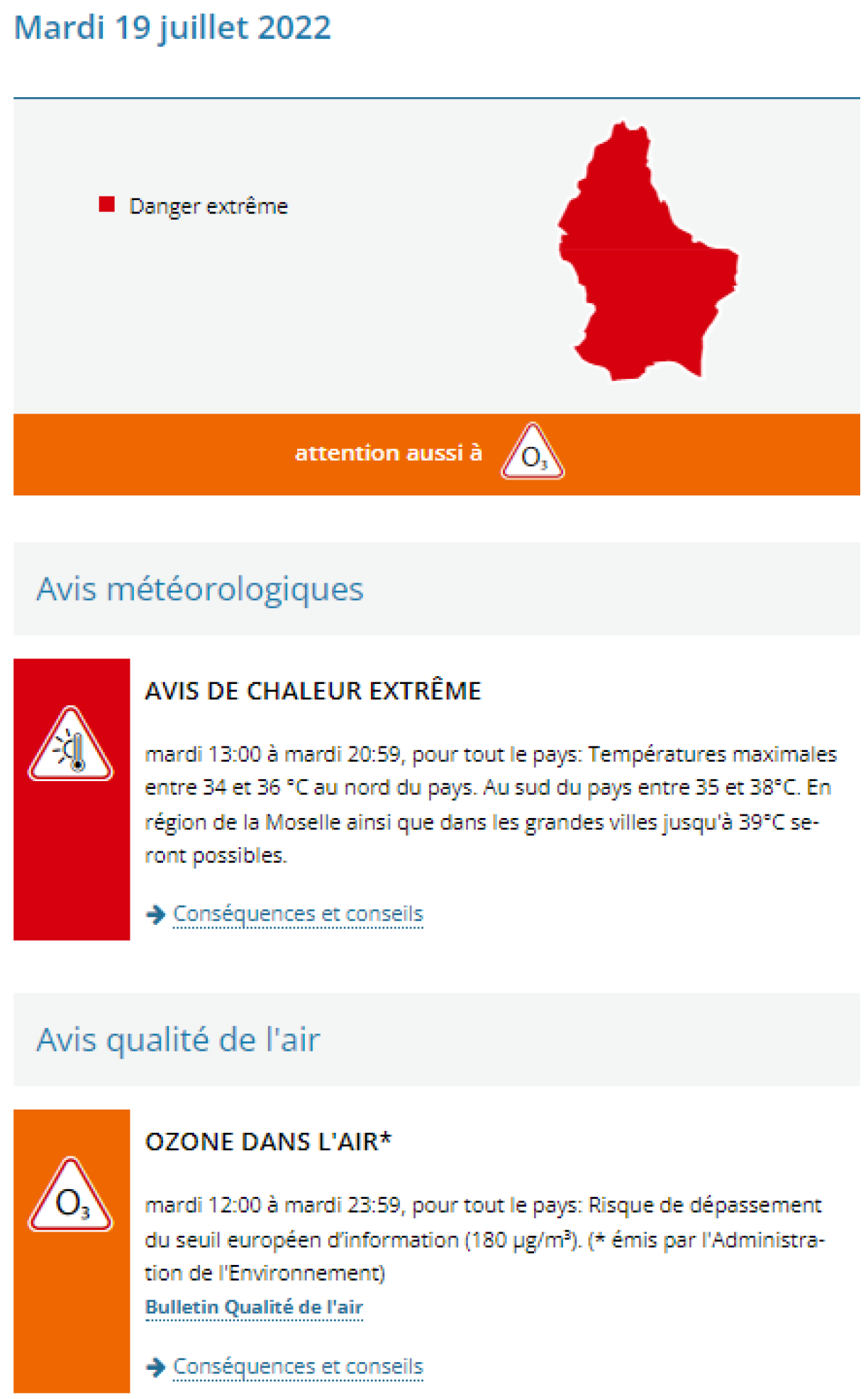 D’Hëtzt an déi vill Sonn huet natierlech Repercussiounen op d’Ozon-Wäerter an der Loft. Um Dënschdeg ass et gutt méiglech, datt lokal bei den héijen Temperature vu den Informatiounsseuil vun 180 Mikrogramm Ozon op e Meterkibb Loft wäert depasséiert ginn. D’Equatioun “vill Sonn heescht vill Ozon” stëmmt also.