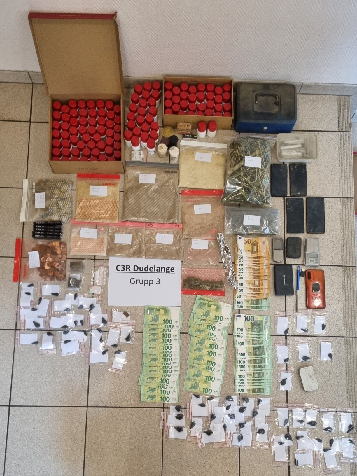 Wéi d’Police doropshin d’Wunneng vum Mann duerchsicht huet, goufen hei nach eng Kéier 262 Gramm Marihuana, 835 Gramm Heroin, 56 Gramm Haschisch, 3 Ecstasy-Pëllen, eng gréisser Zomm Boergeld an Drogenutensilie séchergestallt. De presuméierten Dealer gouf op Uerder vum Parquet festgeholl an hat en Donneschdeg Rendez-vous beim Untersuchungsriichter. Dësen huet decidéiert, datt de Verdächtegen an Untersuchungshaft op Schraasseg sollt bruecht ginn.