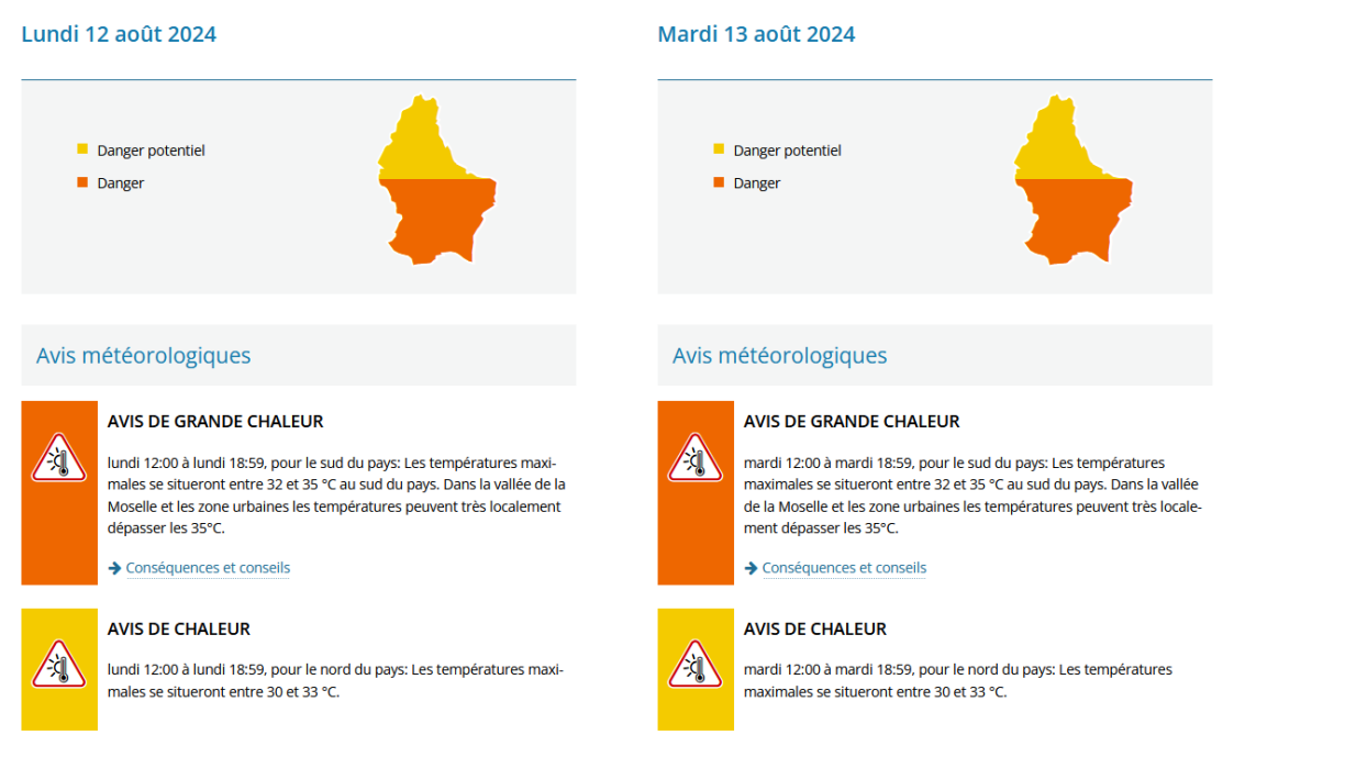 Dës Aläerte huet e Sonndeg nach fir de ganze Grand-Duché gegollt. E Méindeg de Moie huet MeteoLux d’Warnung awer fir de Süden ugepasst. Wéinst Temperaturen tëscht 33 a 35 grad huet ee se fir déi Regioun vum Land op “Orange” eropgeschrauft. Dës Warnung gëllt och nees fir e Méindeg an en Dënschdeg.