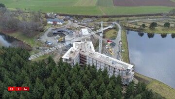 Vu wäitem erkennt een e grousse Kran an e risege Komplex ass aus dem Buedem erausgewuess.
