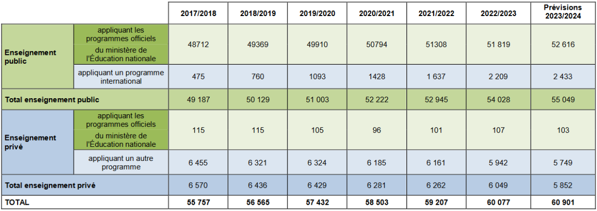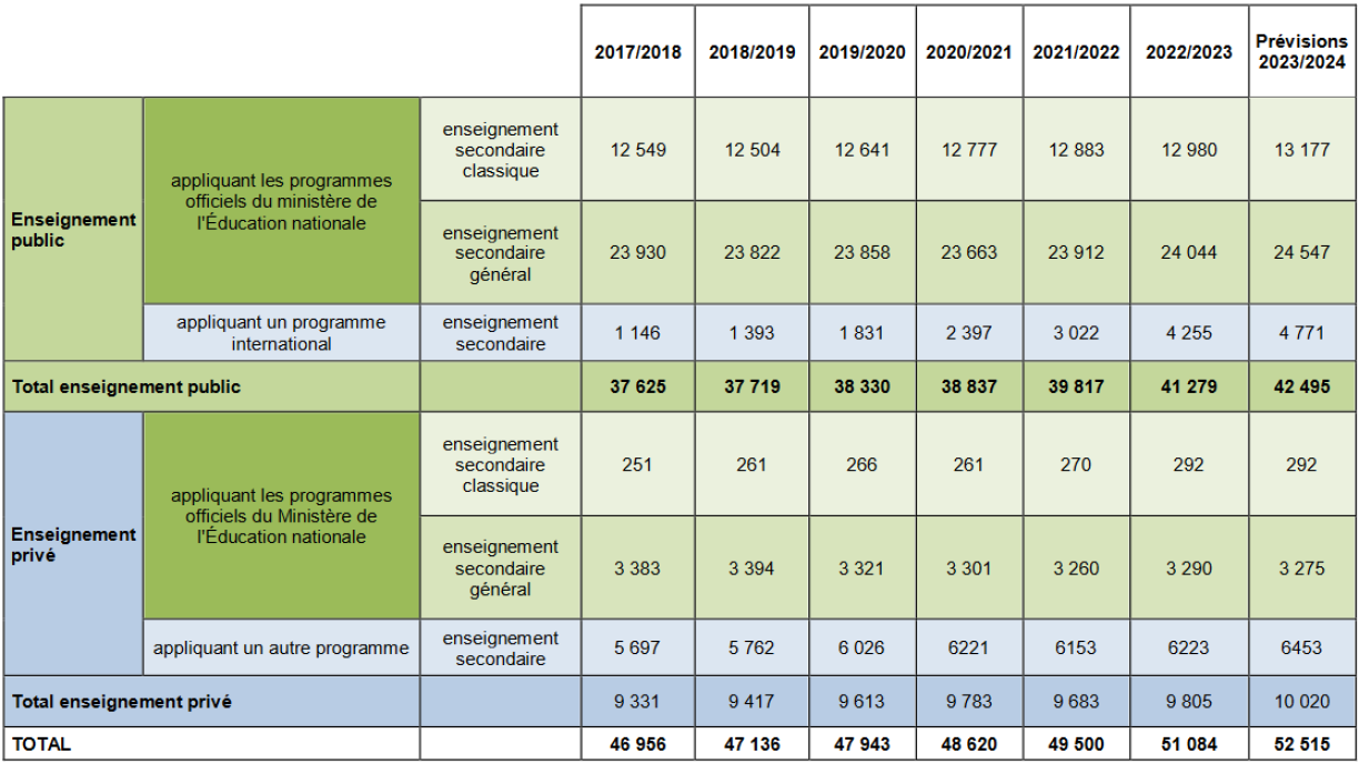 Am Secondaire sinn et der 52.515 Schüler, bei 5.480 Proffen. Mat knapp 2.100 sinn déi meescht Schüler am Lyçée technique du Centre.