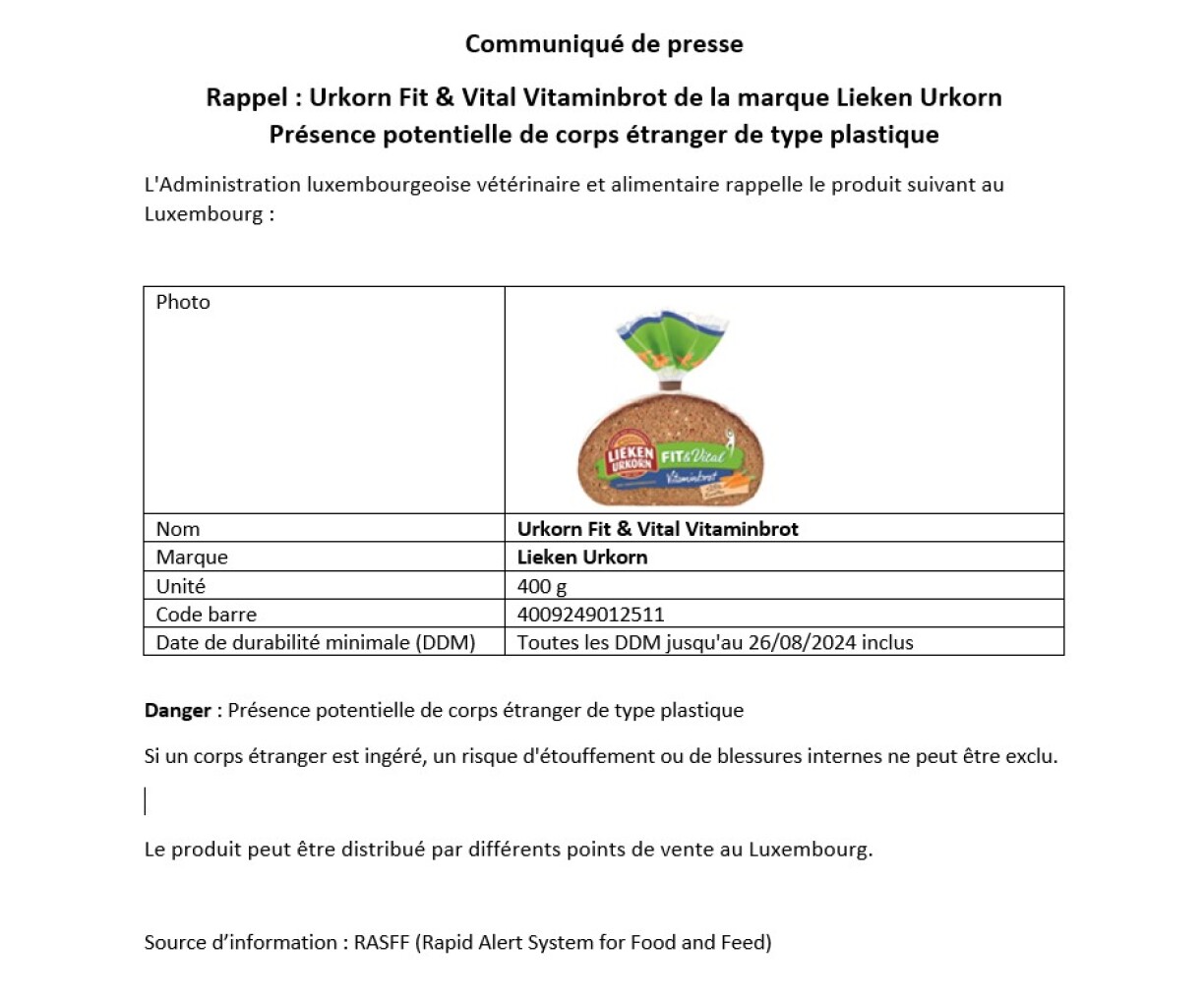Am “Urkorn Fit & Vital"-Vitaminbrout, dat a verschidde Butteker zu Lëtzebuerg verkaf gëtt, kënne Friemkierper aus Plastik sinn, wéi d’ALVA e Méindeg matdeelt. De Produit gëtt deemno zeréckgeruff, well en Erstéckungsrisiko beim verschlécke vu Stécker besteet, grad ewéi d’Gefor vu bannenzege Blessuren.