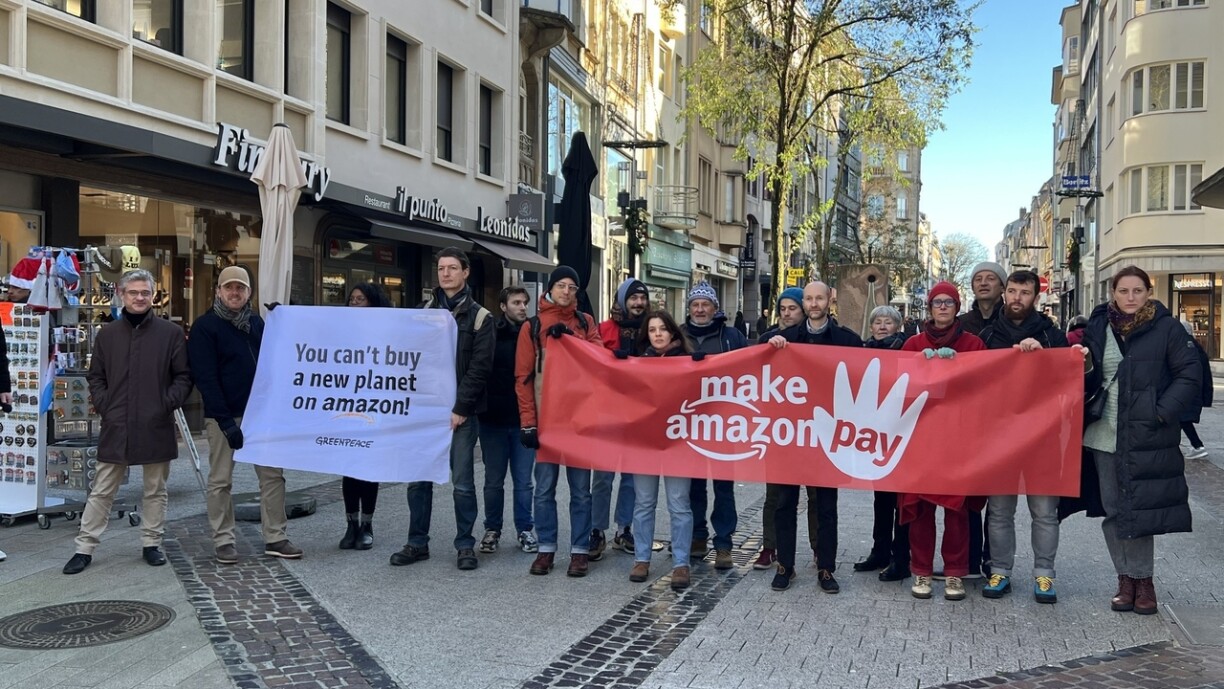 Ënnert dem Slogan “Make Amazon Pay” fuerdere si, dass d’Entreprise hir Approche zu Steier-, Ëmweltfroen an zu den Aarbechter ännert.