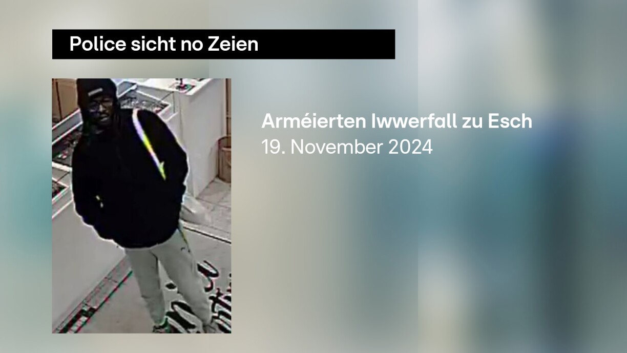 Den Täter hat Pefferspray dobäi an huet eng Partie Bijoue geklaut, ier e sech zu Fouss a Richtung Place de la Résistence aus dem Stëbs gemaach huet.