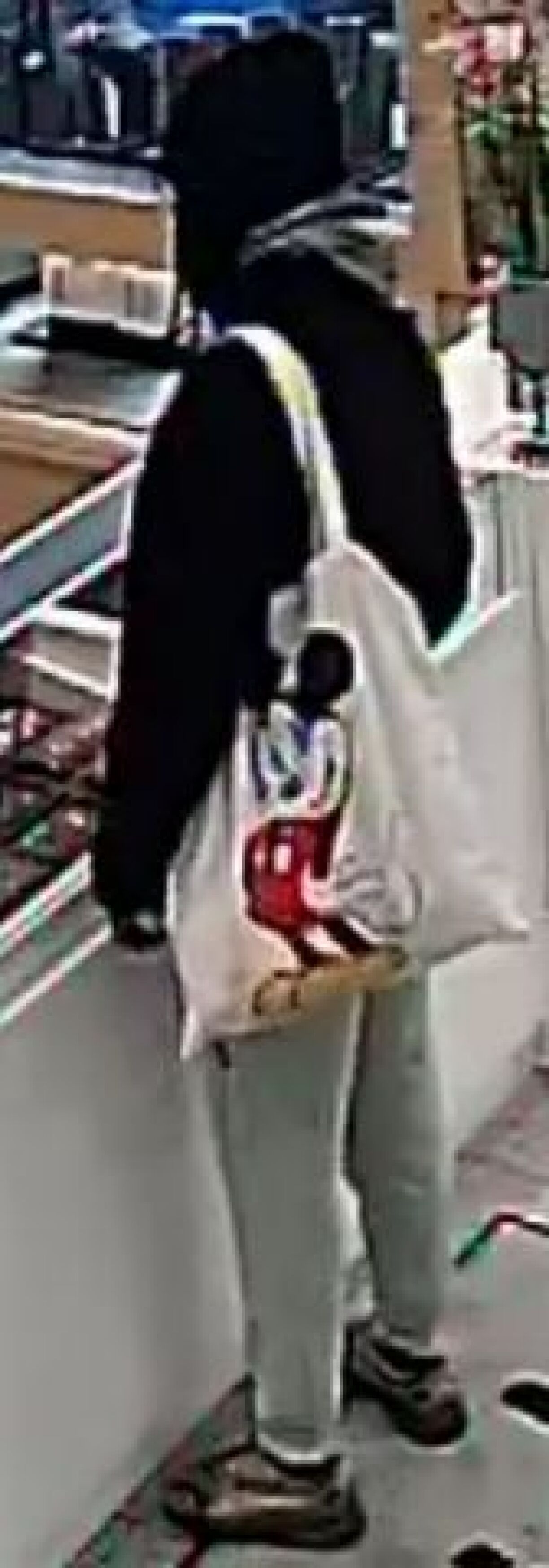 De Mann war tëscht 25 a 35 Joer al an 1,80 bis 1,85 Meter grouss. En huet portugisesch geschwat. En hat eng schwaarz Mutz, eng schwaarz Jackett an eng hellgro Joggingsbox vun der Mark Puma un an och schwaarz-wäiss Schong. Donieft hat eng stoften Tut dobäi, op där d’Figur “Mickey” ze gesinn ass.