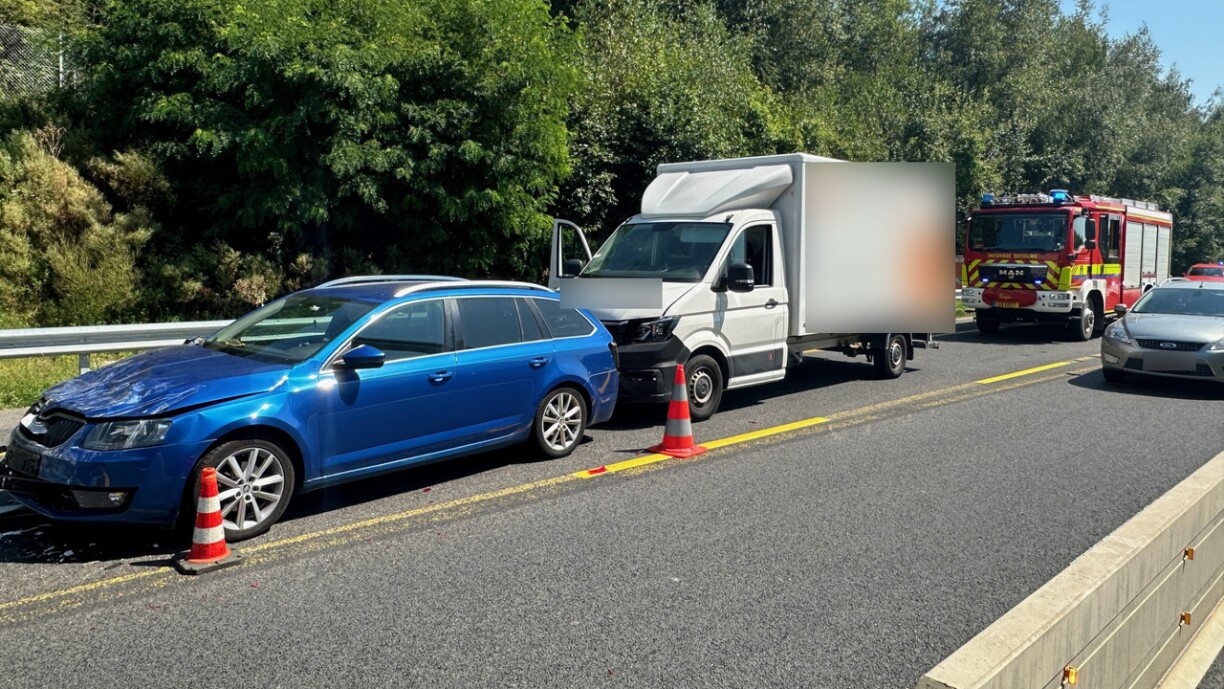 Déi riets Spuer ass den Ament nach blockéiert an et staut sech. Nieft enger Camionnette sinn och eng Roulotte an zwee Autoen involvéiert.