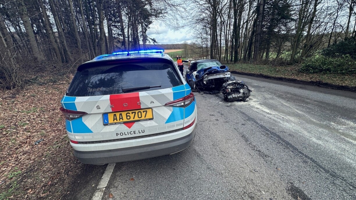 En Automobilist hat d’Kontroll iwwert säi Gefier verluer an ass mat der Bäifuerersäit an e Bam gerannt. Op Fotoen ass ze gesinn, datt de Motor aus dem Auto erausgerappt gouf, dat wuel duerch de Schock vum Impakt.