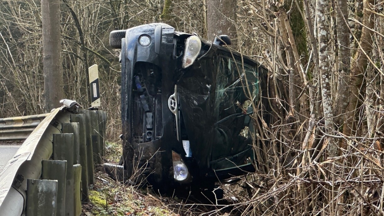 E Chauffer hat an enger Lénkskéier d’Kontroll iwwert säin Auto verluer a war mat dësem iwwer d’Ofspärung geflunn. Hien ass schliisslech mat sengem Gefier nieft de Beem un d’Stoe komm. De Mann koum fir eng Kontroll an d’Spidol.