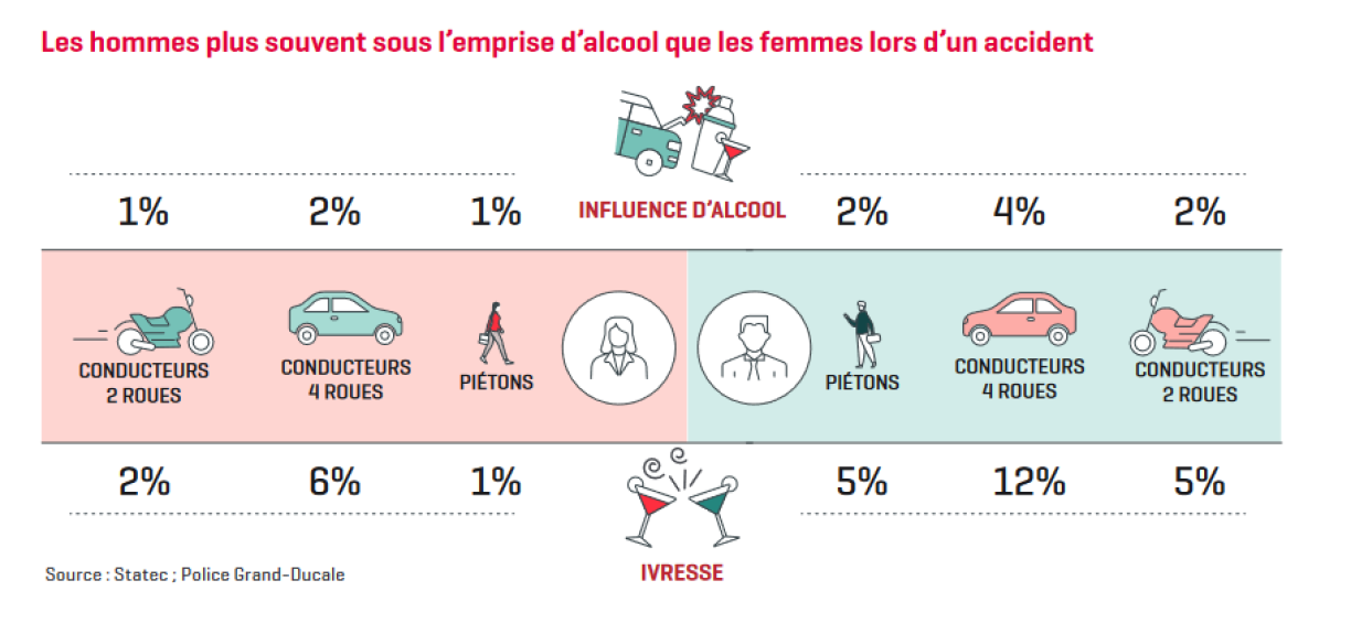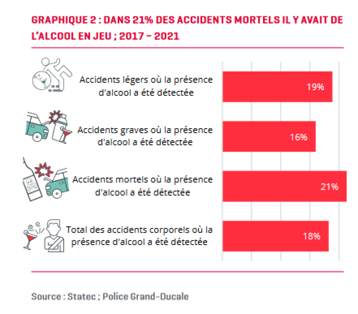 Bei 21 Prozent vun allen déidlechen Accidenter tëscht 2017 an 2021 war Alkohol am Spill. Am heefegste koum et bei Accidenter ënner Alkoholafloss zu Kollisioune mat anere Gefierer. Aner Grënn fir d’Accidenter waren, dass de Chauffeur vun der Strooss ofkomm respektiv an e Bam, soss en Obstakel oder e geparkten Auto gerannt ass.