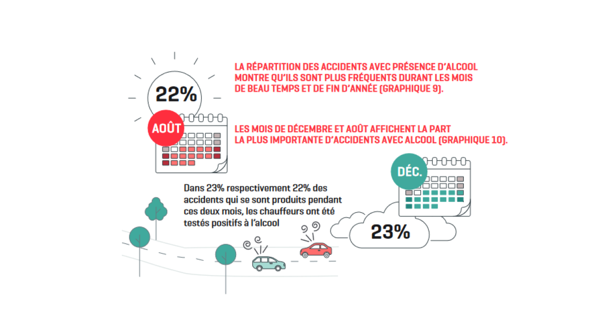 Net iwwerraschend koum et am dacksten Nuets zu Accidenter ënner Alkoholafloss. Awer och am Summer oder um Enn vum Joer. Haaptgrond vun engem Accident beim Fueren ënner Alkoholafloss ass dem Statec no mat 41 Prozent iwwerhéichte Vitess. Dat ass zwar och esou bei Leit, déi net gedronk hunn, mä awer just mat engem Taux vun 21 Prozent. Aner Grënn sinn d’Iwwerfuere vun der Stroossemarkéierung oder ze not opfueren op d’Gefier virdrun.