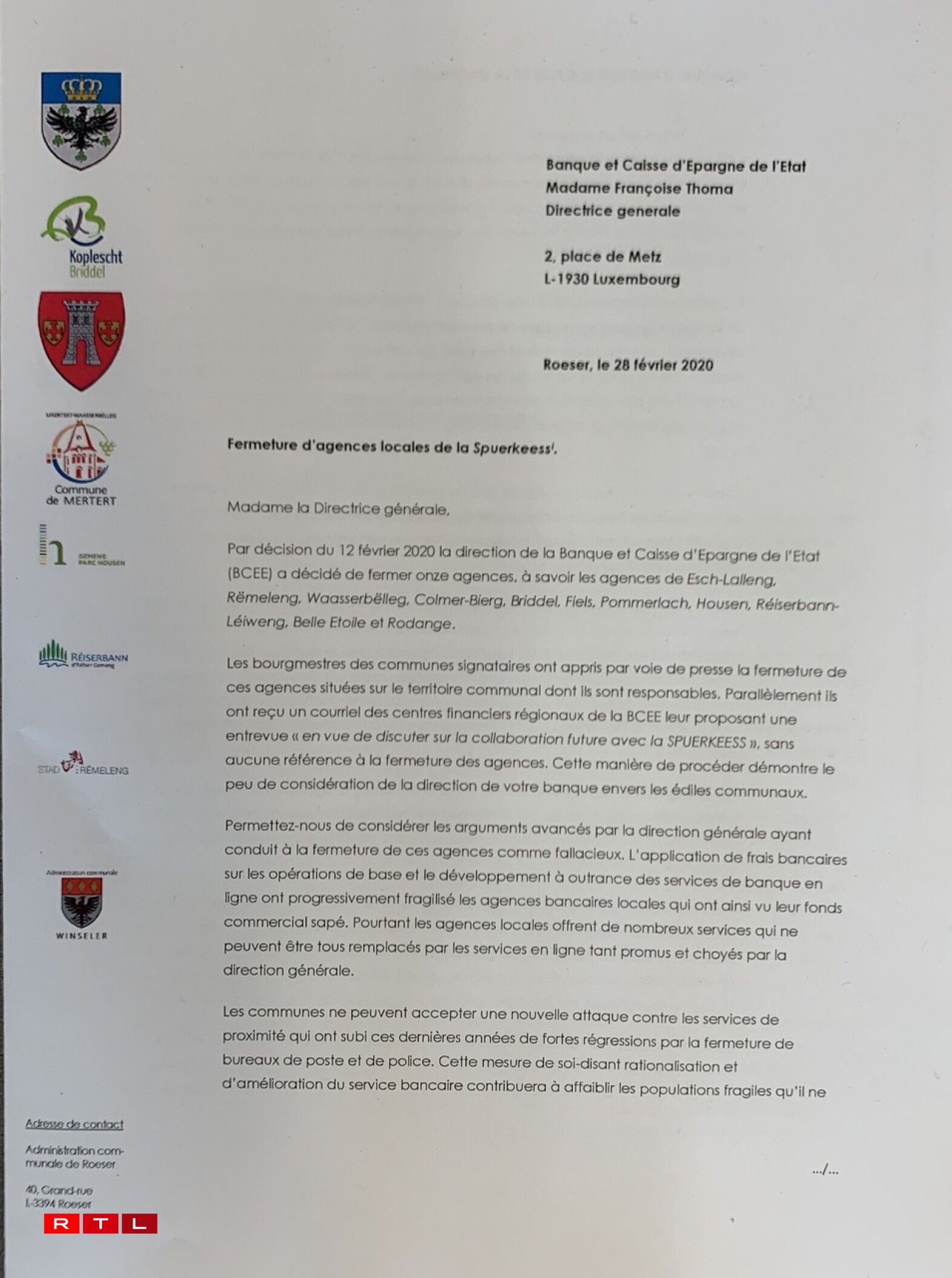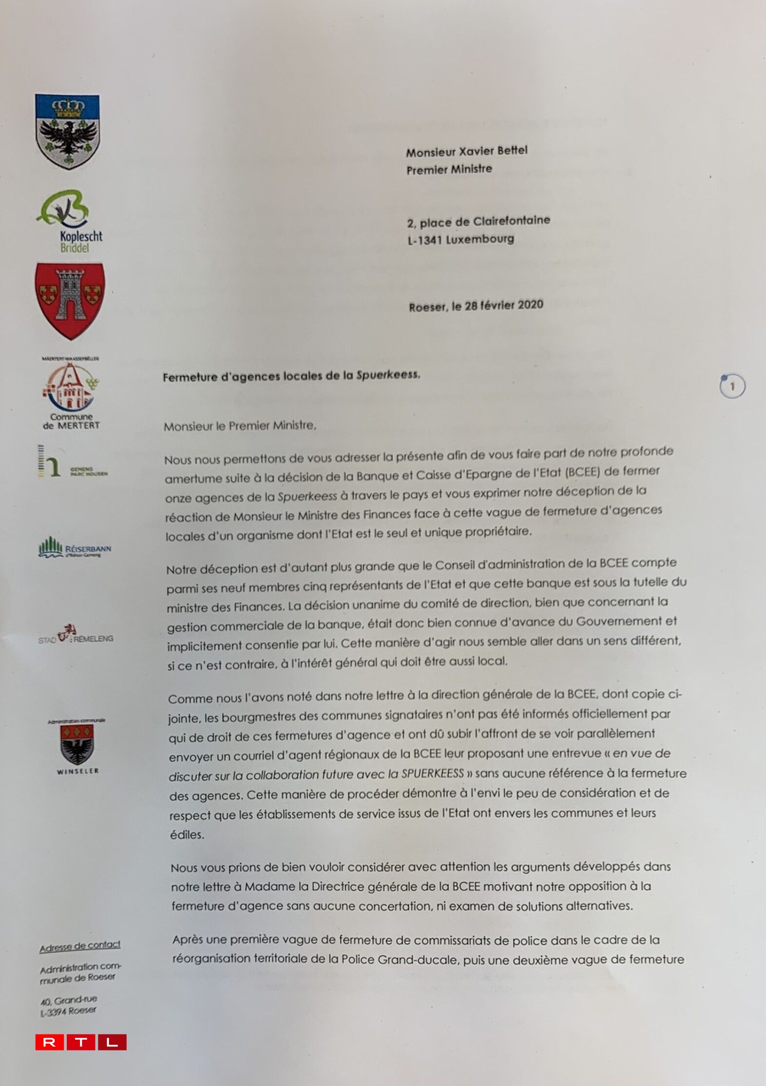 Mat engem Bréif un d’Generaldirektesch vun der Spuerkeess an un de Premier wëllen d’Buergermeeschtere vun 8 Gemenge probéieren, d’Zoumaache vun der Bankagence bei sech, Enn Mäerz, ze verhënneren. Donieft huet een och eng Entrevue gefrot, fir déi eegen Doleancen duerzeleeën.