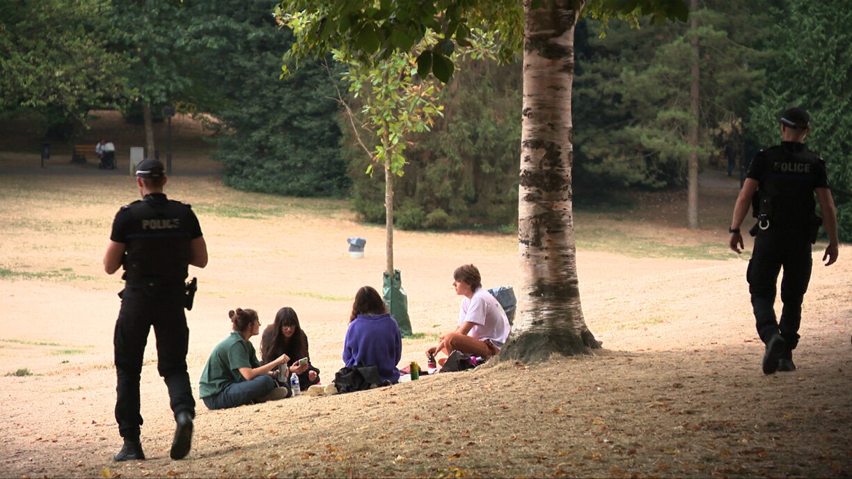 Catherine Weber: “Mir sinn elo hei effektiv duerch de Park gaangen. Hei sinn elo 2 Persoune kontrolléiert ginn, déi hei ënnerwee waren, do ass awer elo näischt weider festgestallt ginn an déi Persounen sinn dunn normal weidergaangen.”