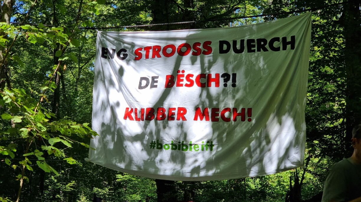 Zanter e Freideg ass elo eng nei Beweegung aktiv ginn - ënnert dem Slogan “Bobi Bleift” huet sech e Grupp vun Aktivisten am Bësch installéiert. Dës Zort vu Bëschbesetzunge kennt een ewell aus anere Länner, zu Tréier zum Beispill blockéieren d’Ëmweltaktiviste vu “Besch bleibt” zanter 2021 de Bësch fir den Ausbau vun der Autobunn, de sougenannte Moselaufstieg ze verhënneren.