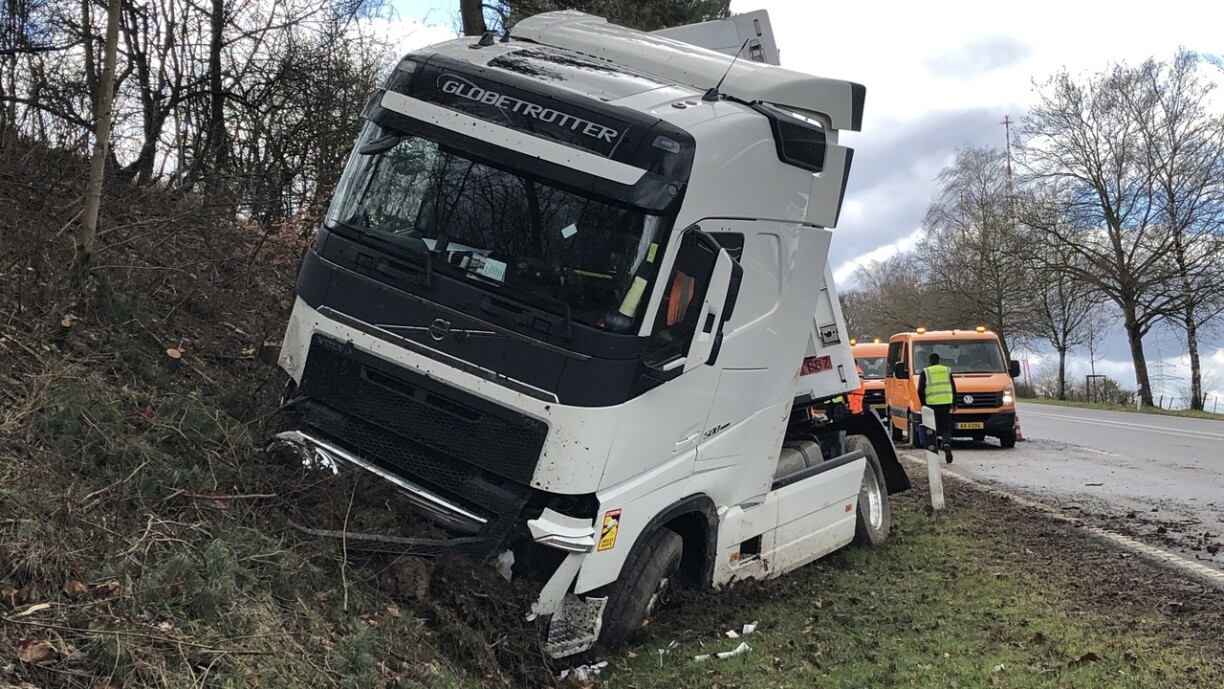 Hien ass an de Gruef geroden a krut dunn e Bam frontal ze paken. De Camion huet nawell en zolitte Schued dovugedroen, ma de Chauffer schéint éischten Informatiounen no net blesséiert ginn ze sinn.