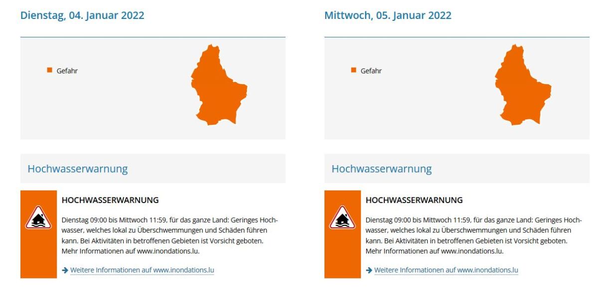 Leit déi laanscht Flëss wunnen, solle sech iwwer inondations.lu informéieren a wa se menge se kéinte betraff sinn, Mesuren ergräifen déi een op infocrise.lu fënnt.