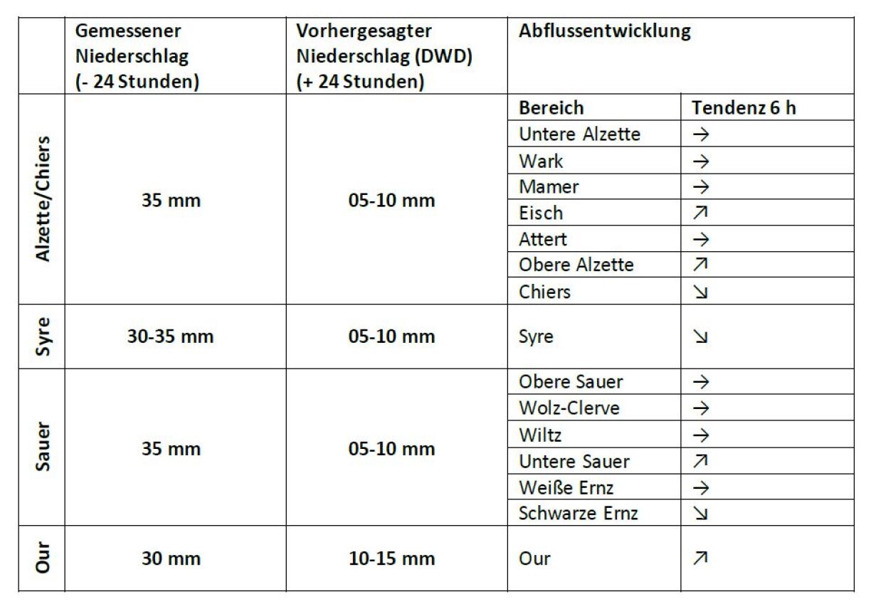 Mat engem Netz vu 40 Miessplazen huet d’Waasserwirtschaftsamt d’Peegelstänn vun de Flëss zu Lëtzebuerg ëmmer am Aen. All 15 Minutte ginn dës gemooss, soudatt séier ka reagéiert ginn. Fir d’Leit ze warne ginn et dräi ënnerschiddlech Phasen.