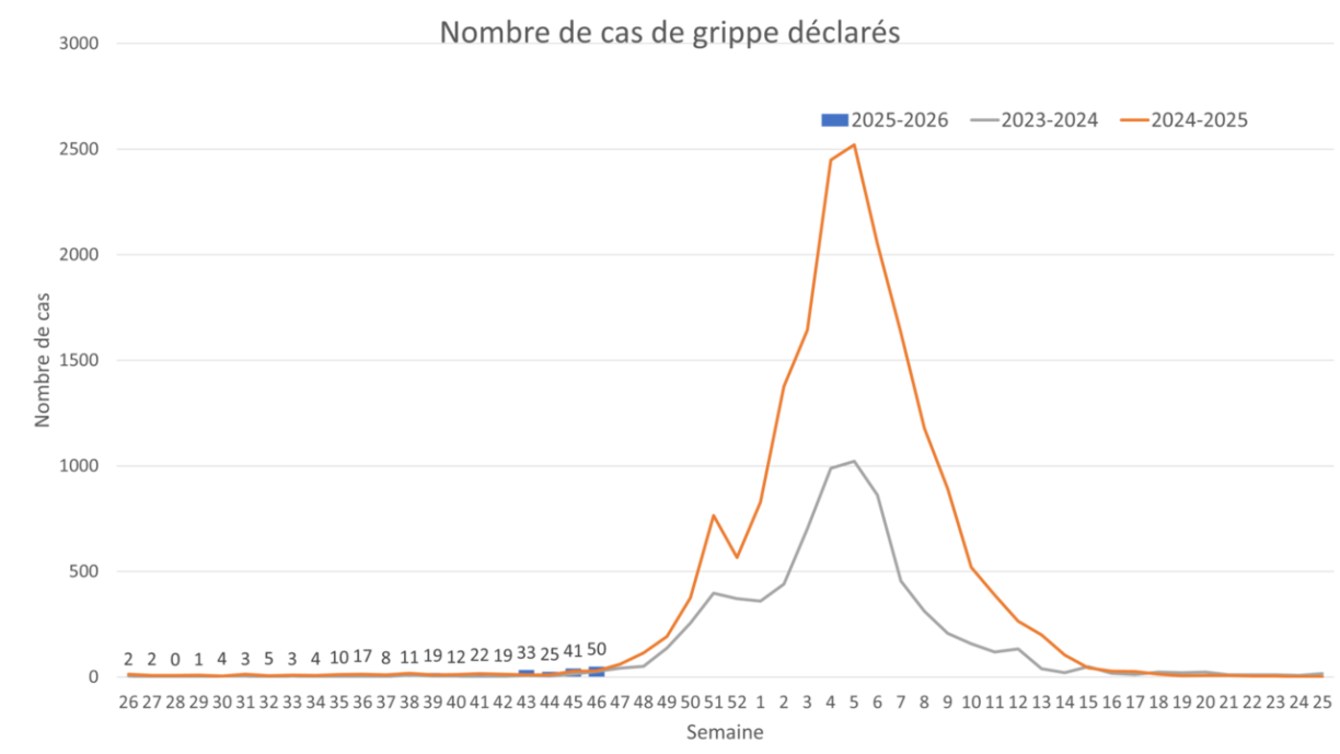 Am selwechten Zäitraum ass d’Zuel vun den Influenza-Infektioune vun 41 op 50 geklommen. A 94 Prozent vun de Fäll huet et sech ëm den Typ A gehandelt.