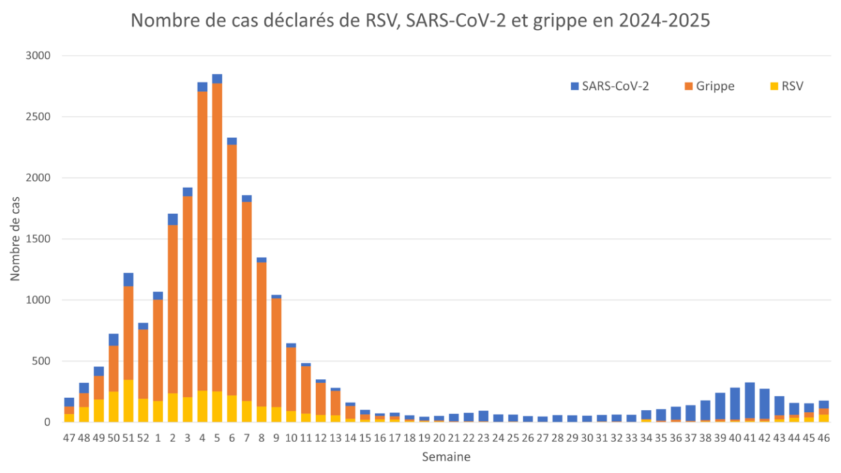 Beim Virus respiratoire syncytial (RSV) ass d’Zuel vun de Fäll ëm 55 Prozent geklommen, mat 62 Infektioune géintiwwer 40 an der Woch virdrun. Zanter Oktober sinn a 75 Prozent vun de Fäll Kanner ënner 7 Joer betraff.