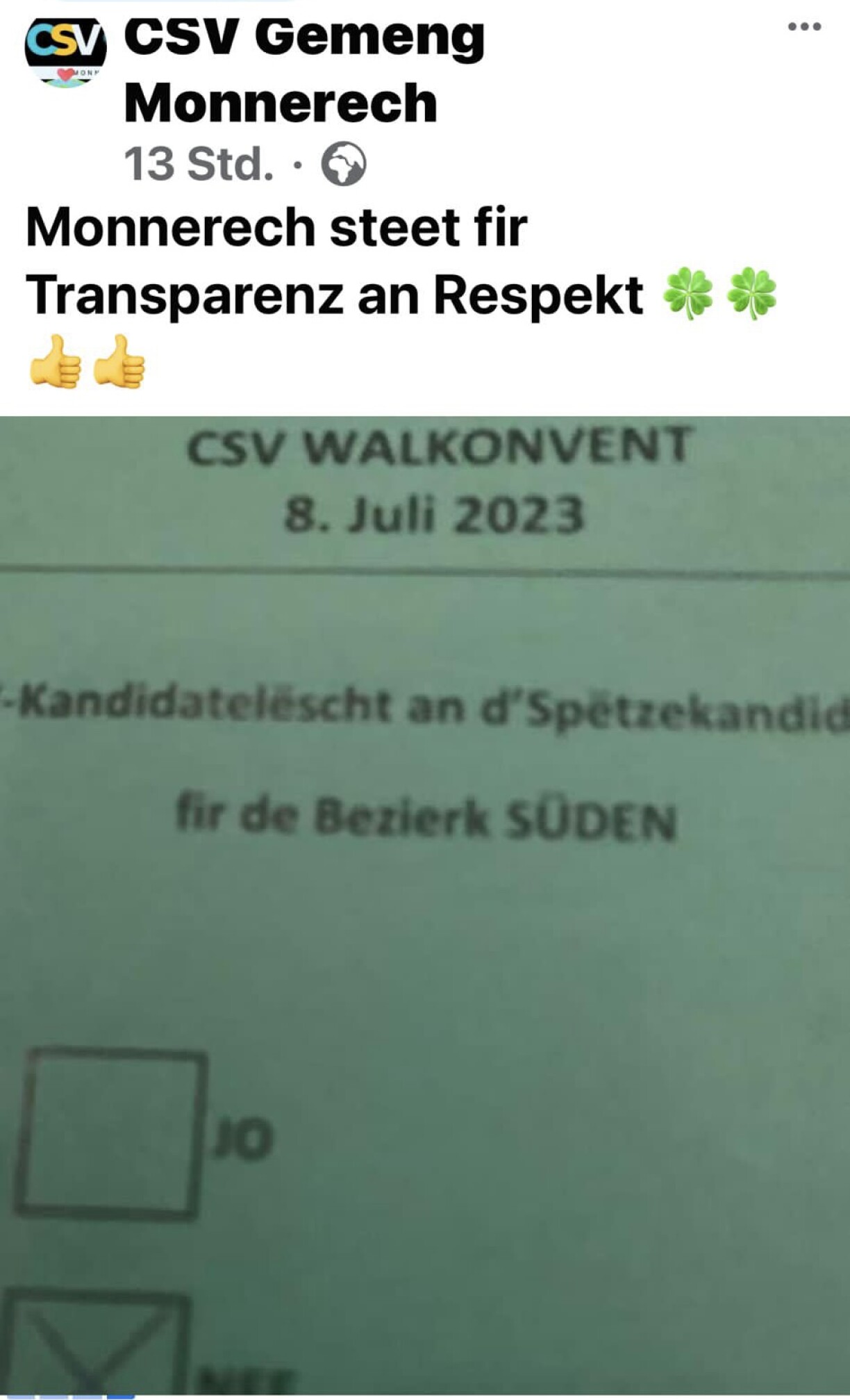 E Post vun der CSV-Sektioun Monnerech op der social media Plattform Facebook schwätzt eng kloer Sprooch. Zwar gouf um Konvent anonym iwwer d‘Wallëschten ofgestëmmt. Ma d‘Sektioun Monnerech hat en Stëmmziedel fotograféiert an online publizéiert: d‘Këscht virum Jo bleift eidel, an der vum Nee steet e Kräiz. Monnerech stéing fir Transparenz an Respekt stoung iwwer der Foto. Dofir gouf géint d‘Süd-Lëscht gestëmmt, esou gëtt suggeréiert. Antëscht ass d‘Foto vun der Plattform verschwonnen. Den Text steet nach do.