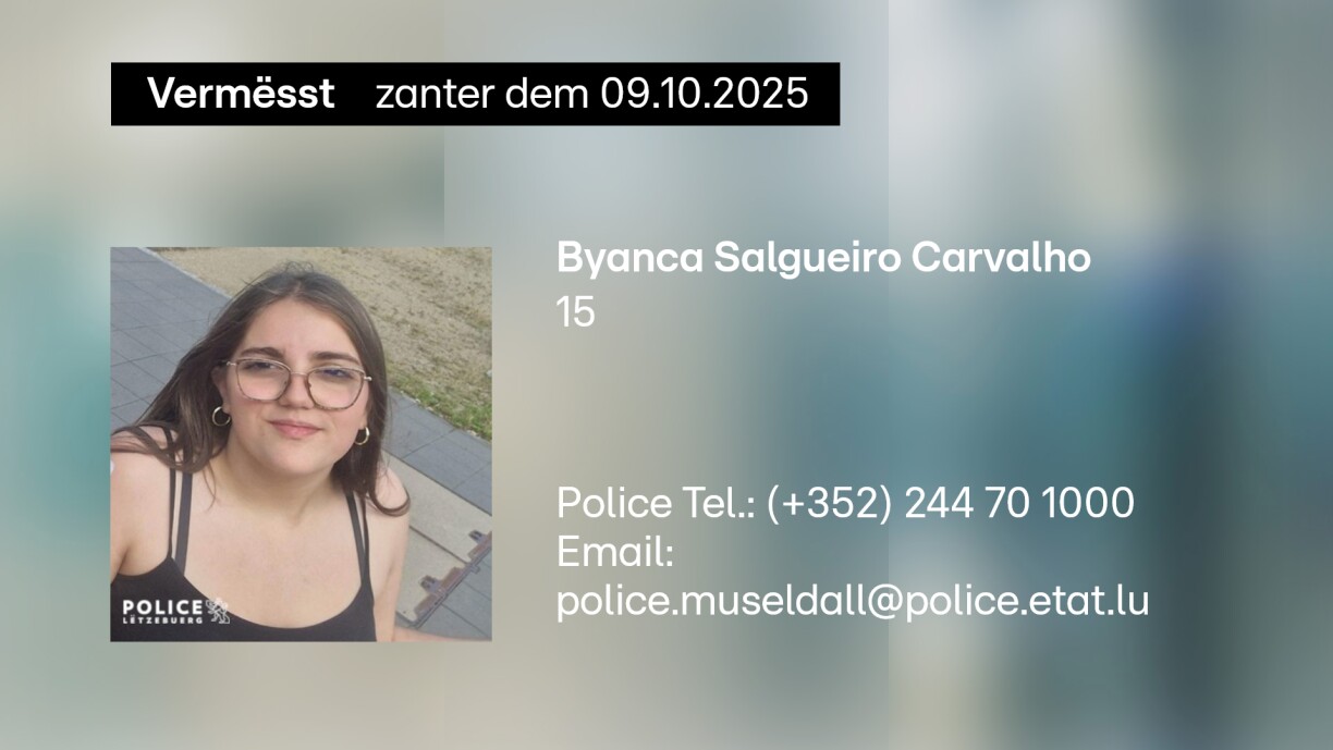D’Police rappelléiert, datt nach ëmmer no dem 15 Joer ale Meedche gesicht gëtt. Wien Hiweiser huet, wou sech dat jonkt Meedche kéint ophalen, dee gëtt gebieden, sech beim Policebüro Museldall ze mellen, dat ënnert der Nummer (+352) 244 70 1000 oder per Mail u police.museldall@police.etat.lu.