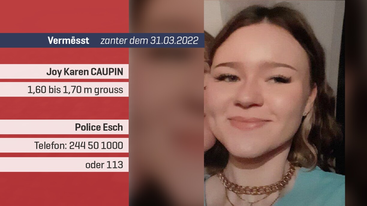 Fir d’lescht gouf déi Vermëssten um 14 Auer zu Zolwer gesinn. Si ass 1,60 bis 1,70 Meter grouss, gouereg a soll zulescht eng schwaarz Box, e schwaarz-rout Iewescht a keng Schong ugehat hunn.