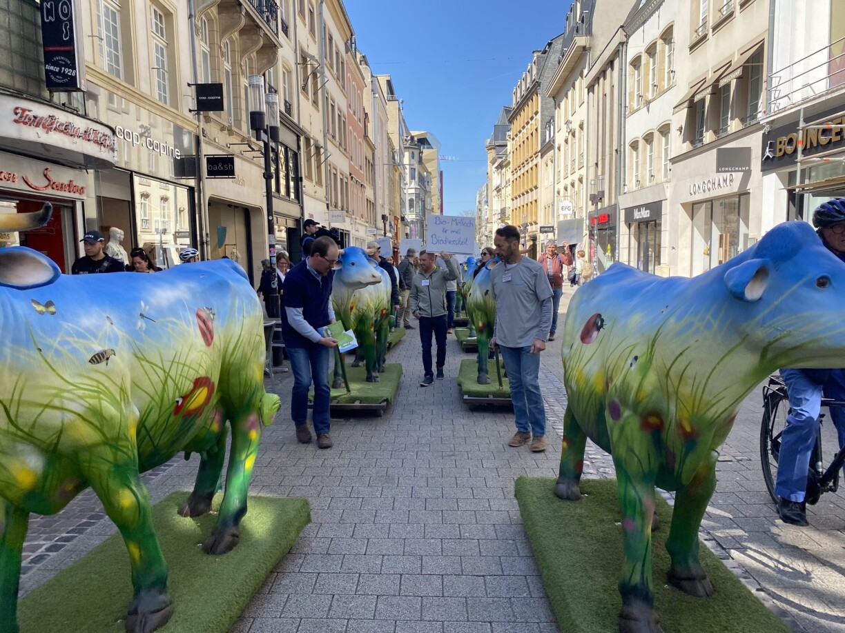 D’Biobaueren an hir 12 “Bio-Divaen” si vum Glacis bis d’Clairefontainesplaz gezunn. D’"Bio-Divaen”, dat si keng richteg Kéi, mee Attrappen, déi bemoolt si mat Wiss, Blummen an Insekten. D’Kou sollt erëm méi wäertschätzt ginn. Méi Bio-Kéi heescht méi Biodiversitéit. Dacks géing een héieren, dass d’Kou schiedlech fir d’Klima wier. Heivunner wëlle sech d’BIOG-Mëllechbaueren awer kloer ofgrenzen. Dozou den Tom Kass, Bio-Mëllechbauer vu Rolleng: “Bei eis sinn d’Déieren en zentralen Deel a mir dünge jo just mat deem, wat vun den Déiere kënnt, dat heescht, mir hunn kee chemesch synthetesch hiergestallten Dünger, dat heescht, mir hunn déi ganz Energiekäschte fir d’Produktioun vun Dünger agespuert, déi ëmweltschiedlech Niewewierkungen entstinn doduerch net an doduerch, dass eis Kéi nach erausginn an nach dobausse friessen, ass et eben net sou wéi an der konventioneller Landwirtschaft.”