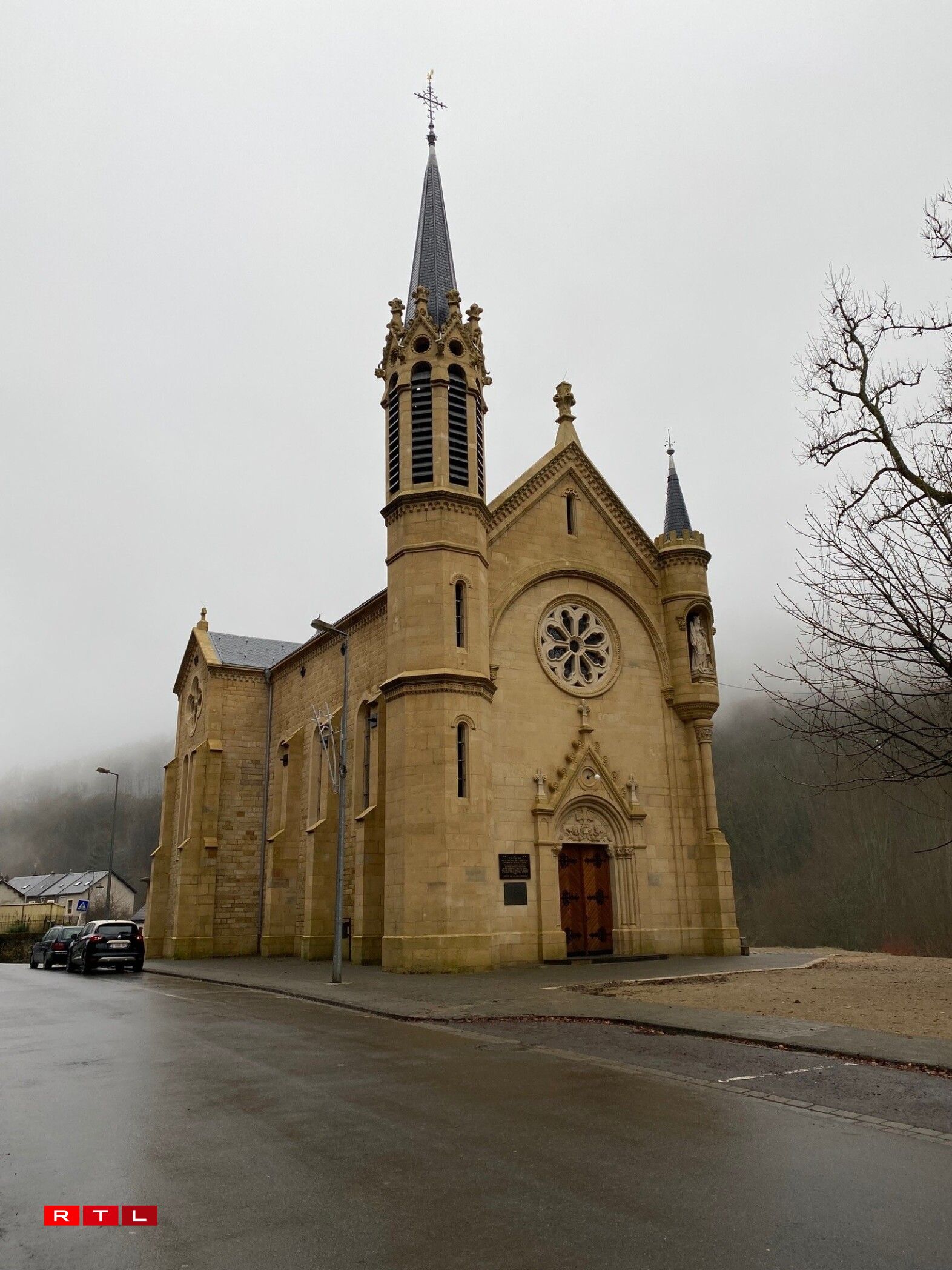 D’Kierch steet ënner Denkmalschutz a gouf deemools op engem Schlakentipp gebaut. 70 Leit fannen hei Sëtzplazen. 150 kënnen der am Stoen eragelooss ginn.