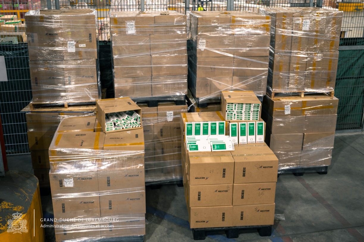 Am Cargoberäich konnten eng 2,4 Milliounen Zigaretten ofgefaange ginn. Dës waren op Pallette verstoppt, op deene sollten Elektronikartikele sinn. Dës koumen aus de Vereenegten Arabeschen Emiraten a sollten a Groussbritannien geschéckt ginn. Dat wier e Steierschued vu ronn 735.000 Euro gewiescht.