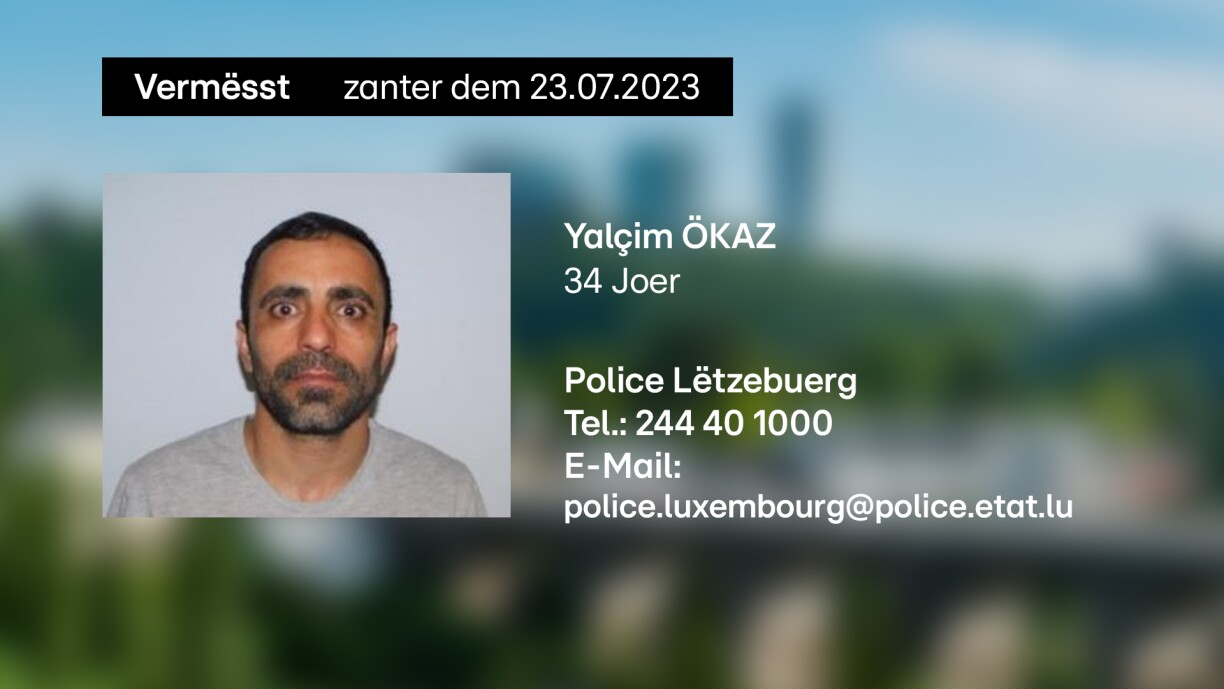 Ween de Mann gesinn huet, oder weess wou e sech ophält, soll sech wgl. bei der Police mellen um Telefon: (+352) 244 40 1000 oder via E-Mail: Police.LUXEMBOURG@police.etat.lu.