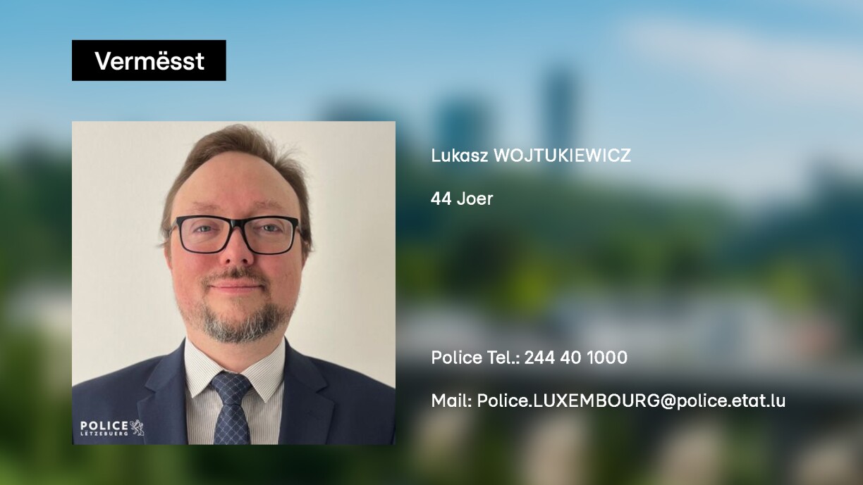 De Lukasz Wojtukiewicz ass wuel mat engem bloen Auto vun der Mark Volkswagen, Modell Scirocco, ënnerwee. Wien Hiweiser huet, wou de Vermësste sech kéint ophalen, soll sech bei der Stater Police um (+352) 244 40 1000 mellen oder per E-Mail op Police.LUXEMBOURG@police.etat.lu.