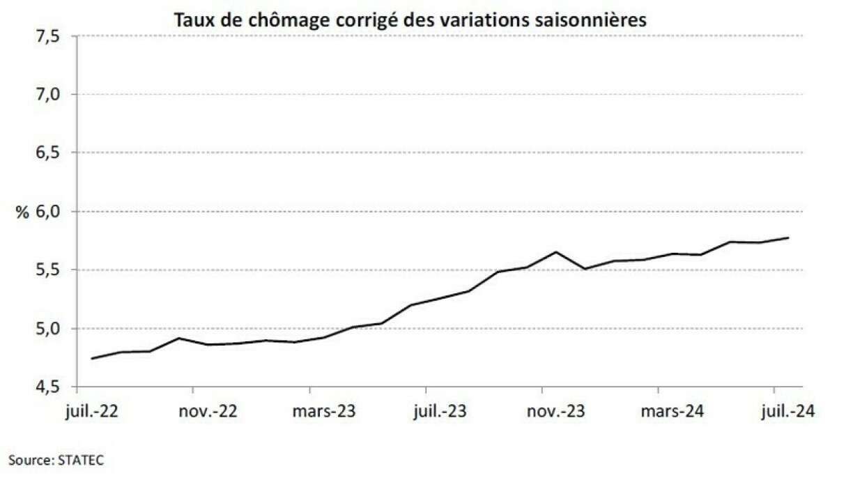 De Chômagetaux, dee vum STATEC ermëttelt gouf, läit den Ament bei 5,8%. D’Zuel vun neien Inscriptioune bei der ADEM ass dogéint stabel bliwwen.