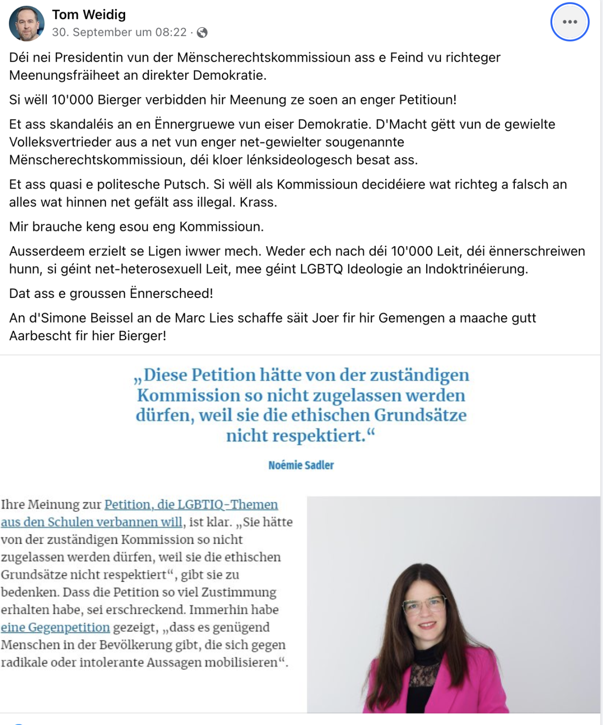 An engem Facebook-Post hat den Tom Weidig op Basis vun engem Interview mat der CCDH-Presidentin, d’Noémie Sadler, als “e Feind vu richteger Meenungsfräiheet an direkter Demokratie” bezeechent.