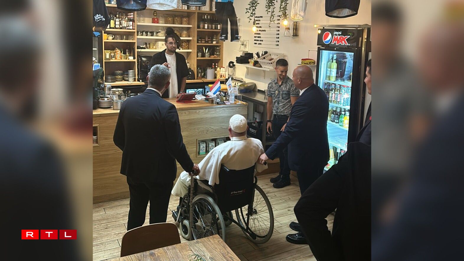 An der Rue Notre-Dame an der Ënneschtgaass schéngt de Poopst wärend senger Visitt am Grand-Duché Loscht op eng Taass Café, méi genee en Espresso kritt ze hunn an ass kuerzerhand hei an e Café eragaangen. Heivir huet hien dann och seng ugekënnegt Mëttespaus ënnerbrach an huet sech eraus ënner d’Leit gemëscht.