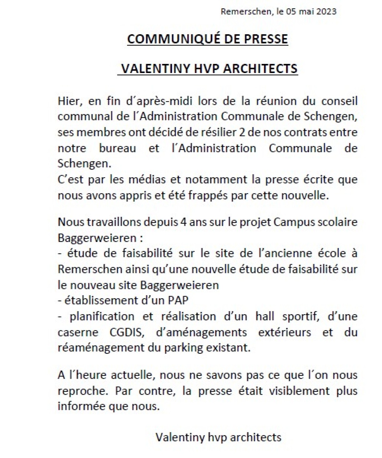No der Diffusioun vum Reportage koum d’Schreiwes vum Architektebüro um Freideg am Nomëtteg. Et wier een iwwer d’Medie gewuer ginn, datt zwee Kontrakter mat der Gemeng opgeléist gi wieren. Derbäi hätt ee 4 Joer laang un deem Projet geschafft. Et géing een och weiderhin net wëssen, wat engem géing reprochéiert ginn. D’Press war besser informéiert wéi mir, sou Valentiny hvp.