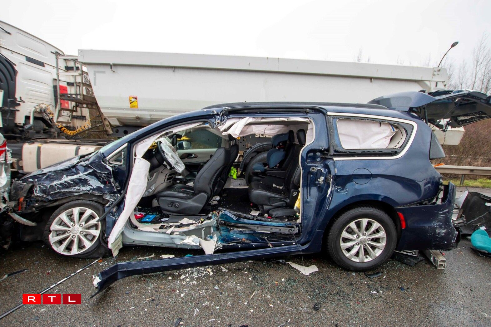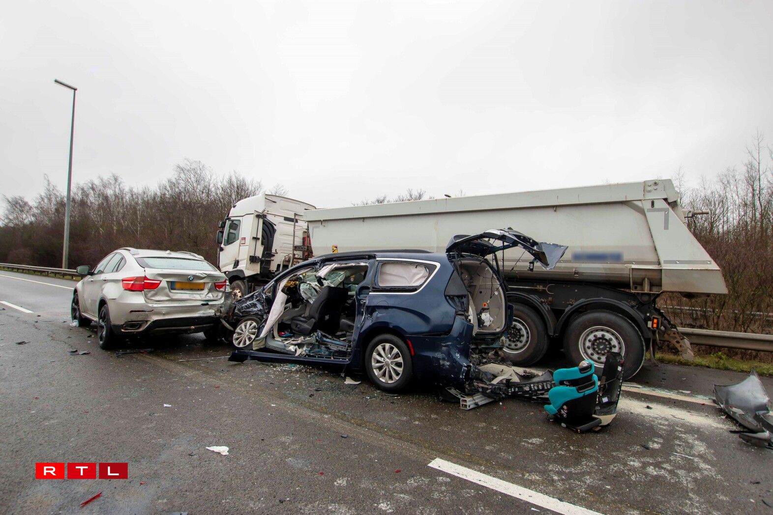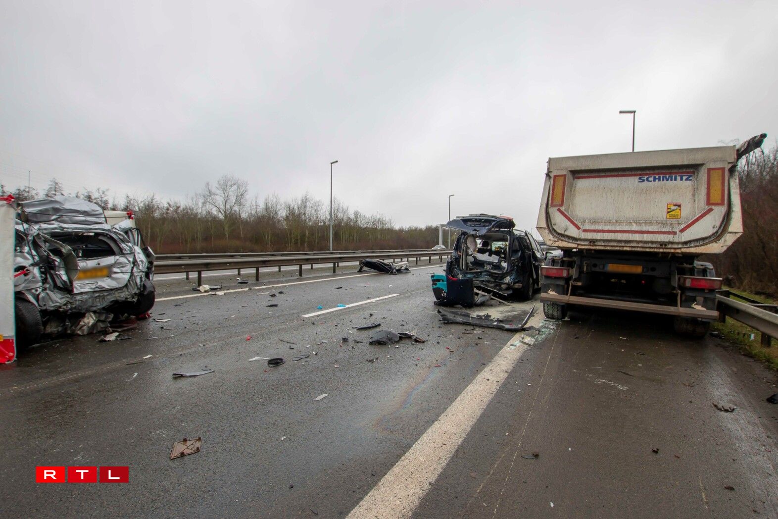 Eng Fra vun 48 Joer aus der Stad ass nach op der Plaz un hire schwéiere Verletzungen verscheet. Eng weider Persoun gouf schwéier verwonnt aus hirem Auto gebuergen a koum an d’Spidol, 3 weider Persoune goufe liicht blesséiert.